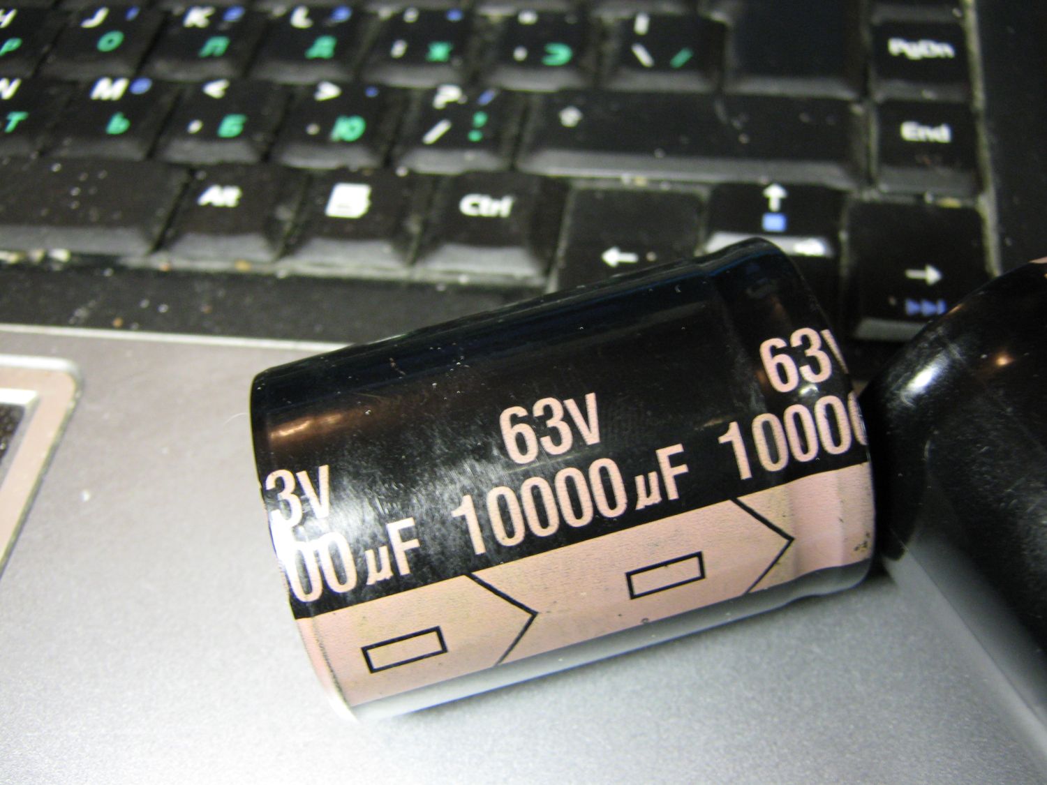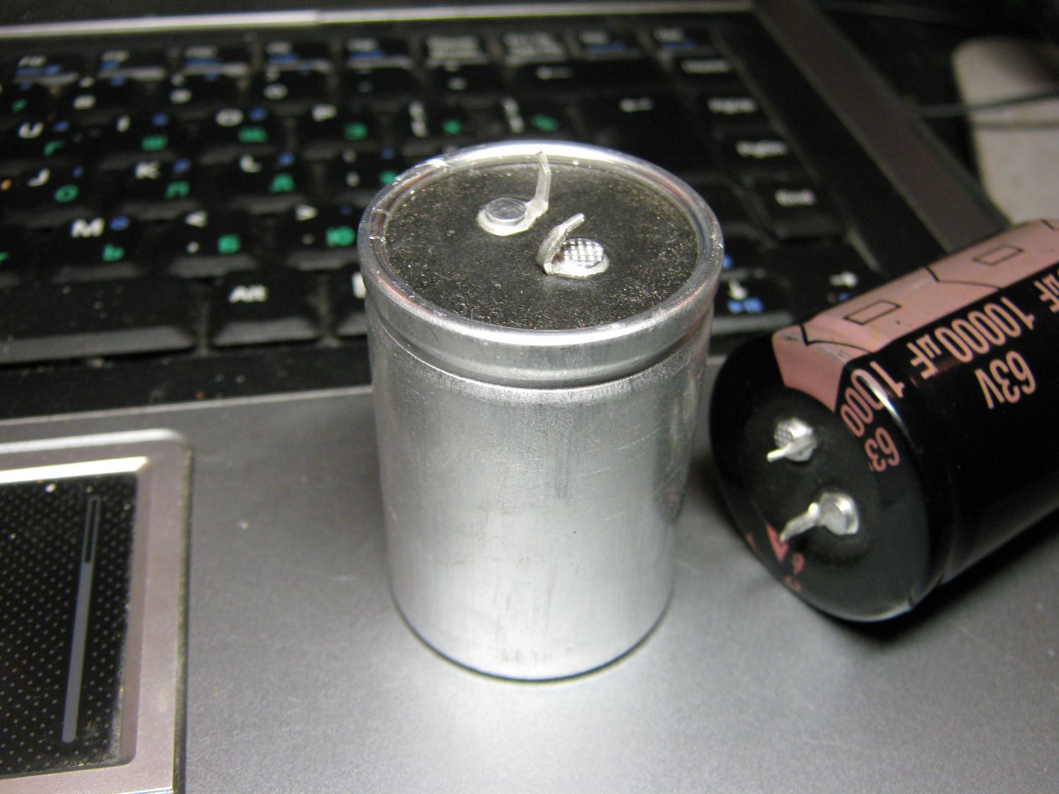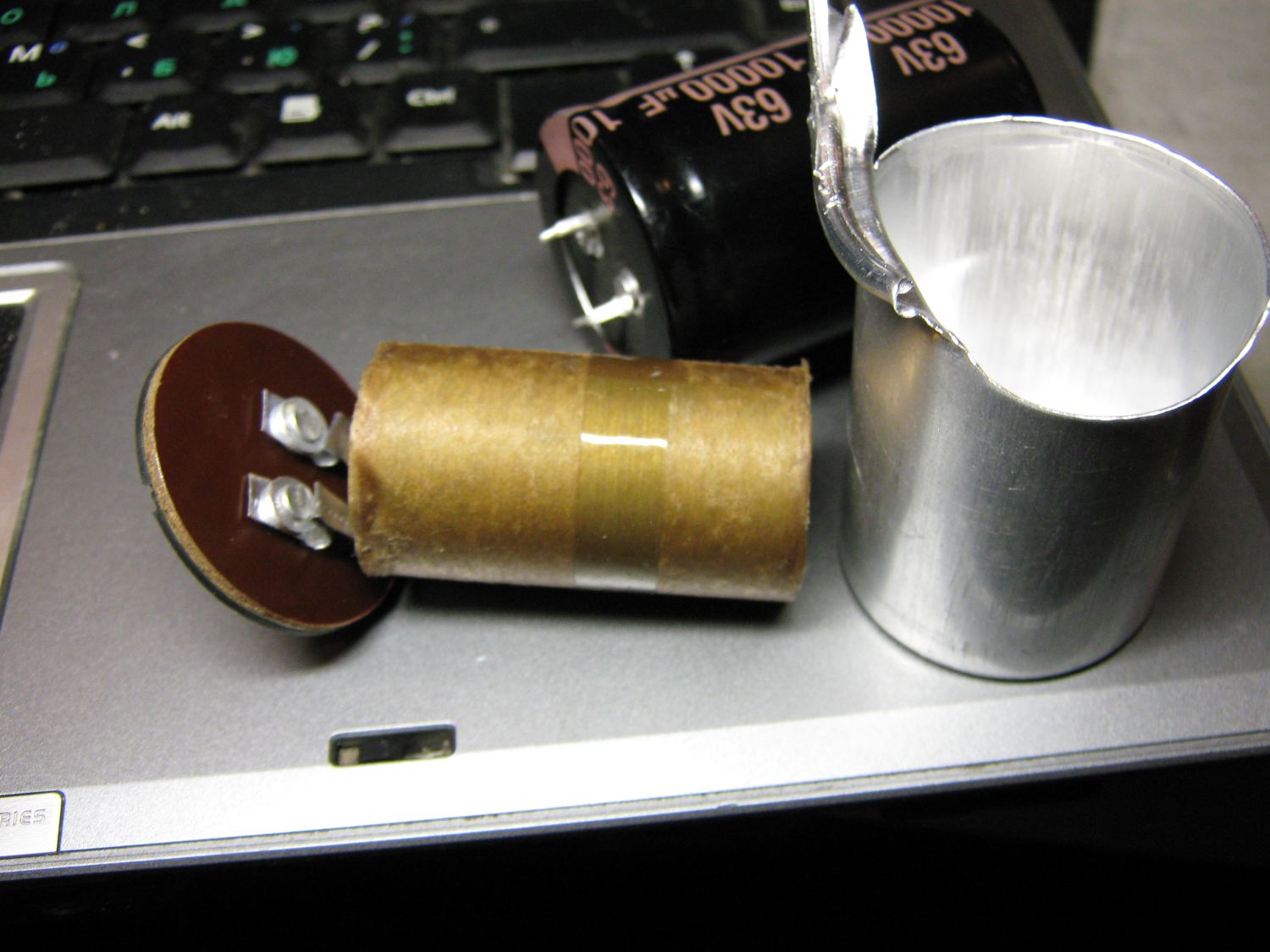 Также все тамже на митинском радиорынке было куплено 2 конденсатора 10000мкф 63в, когда принес домой и положил на стол, заметил очень странное явление для конденсатора, это смещенный центр тяжести . Вскрыл один. Просто интересно, это нормально или нет? К сожалению такую емкость нечем мне померить