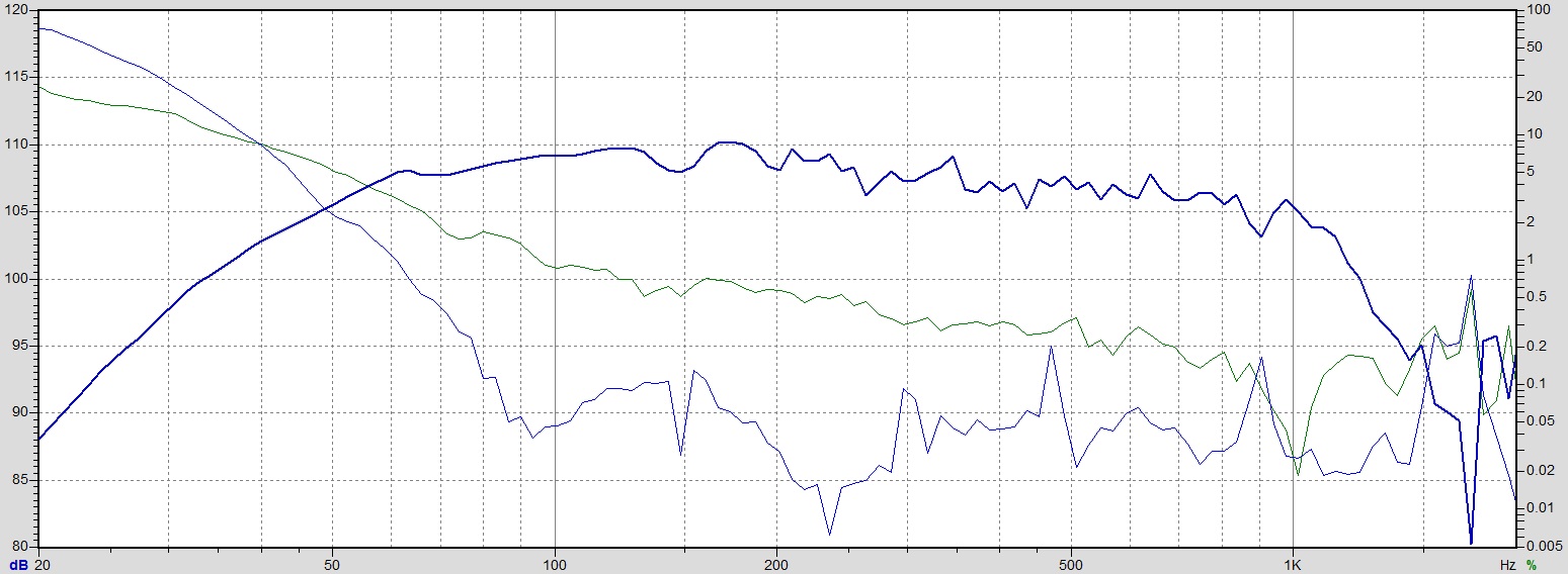 Искажения WF182BD02 при 90дБ давления с 10см. Оформление ЗЯ около 24л. Выше среза (1кГц) на значения смотреть не стоит, т.к. амплитуда уменьшается. Измерялось в готовой АС.