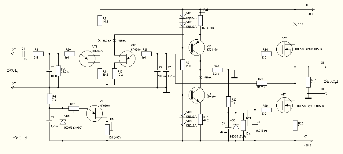 В соседнем топике я попросил совета в решении проблемы возникшей при создании усилителя на основании рекомендаций М. Корзинина, опубликованных в журналах "Радио" в 1995-97 гг. под названием "Схемотехника усилителей мощности звуковой частоты высокой верности". Привожу схему по которой я пытаюсь собрать этот усилитель.