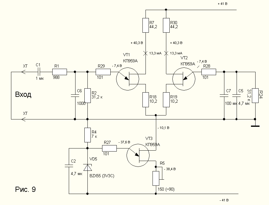 На рис. 9 отдельно входной дифкаскад с токами и напряжениями. Когда он отдельно от схемы то все в порядке, можно замерит все токи и напряжения, они стабильны. Как только соединяю его с УН VT4 VT5 (даже если без выходного каскада), начинается какая-то хренатень. Измерить ничего толком не получается, токи правда остаются почти стабильными, а вот напряжения начинают прыгать. Сильнее всего напряжение плавает в а) на стоке VT3, б) на базе VT4, в) на выходе УН (на R23). Колеблится в очень широких пределах. Ни хрена не понимаю, заблудился в трех соснах, собирал схемы на порядок сложнее, никогда такого гемора не было...