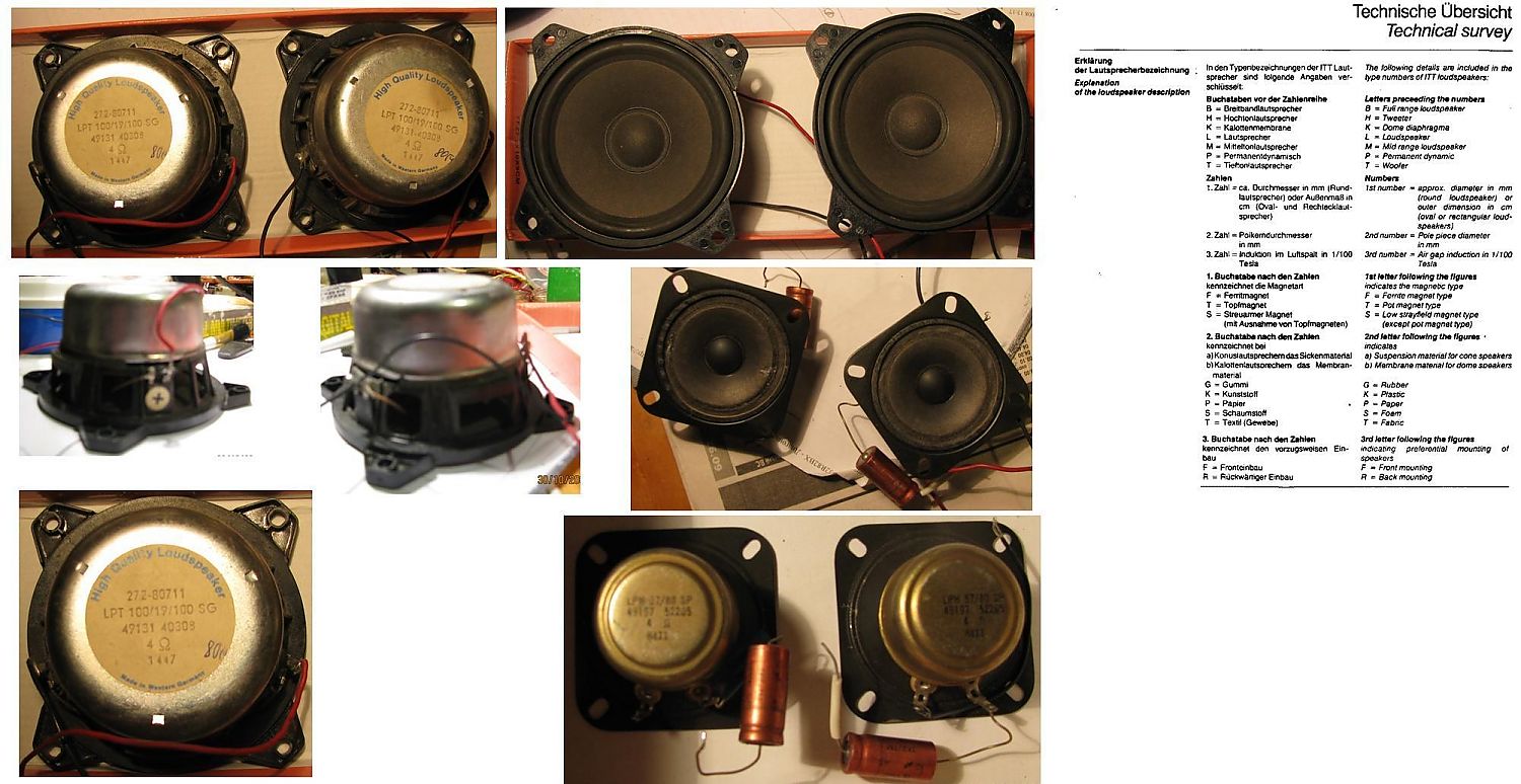 На дины ITT-Nokia есть расщифровка обозначений - спецификация на немецком - см. на фото справа от моего набора- 4`мидбасов + пищалки. Кстати, какую полосу может потянуть такой 4-дюймовик (их данные: Fs=80 Hz, Vэкв=4 литра, ТС-параметры не мерял, конденсаторы к пищам - 10 мкф) ?