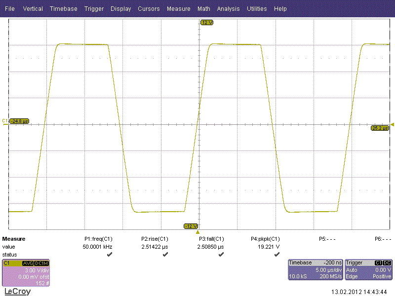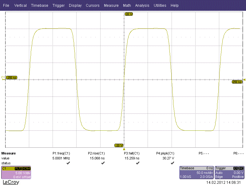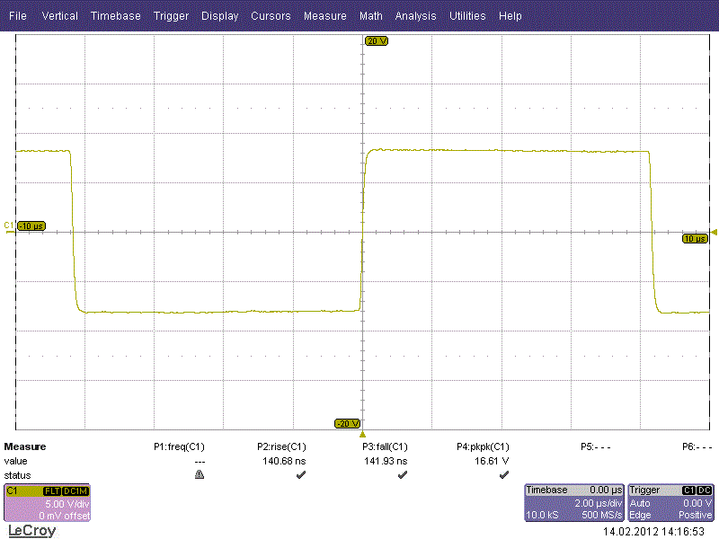 Для чистоты эксперимента привожу осциллограмму тестового сигнала с генератора, скорость нарастания около 2000В/мкс. Частоту тестового сигнала поднял, чтобы можно было оценить форму фронтов, размах и огромную скорость нарастания.