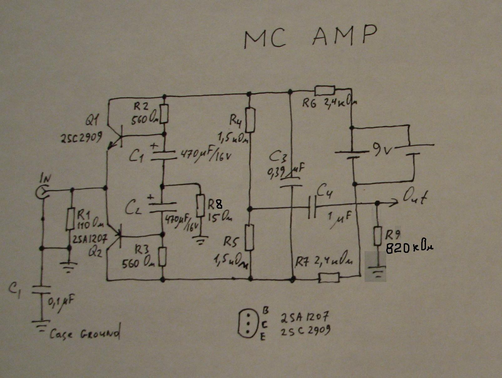 Устройство японское было сделано на макетной печатной плате, на базе транзисторной сборки K-97 от Sony, которая состоит из двух полевых транзисторов. Питание от двух батарей типа "Крона", соединенных параллельно.