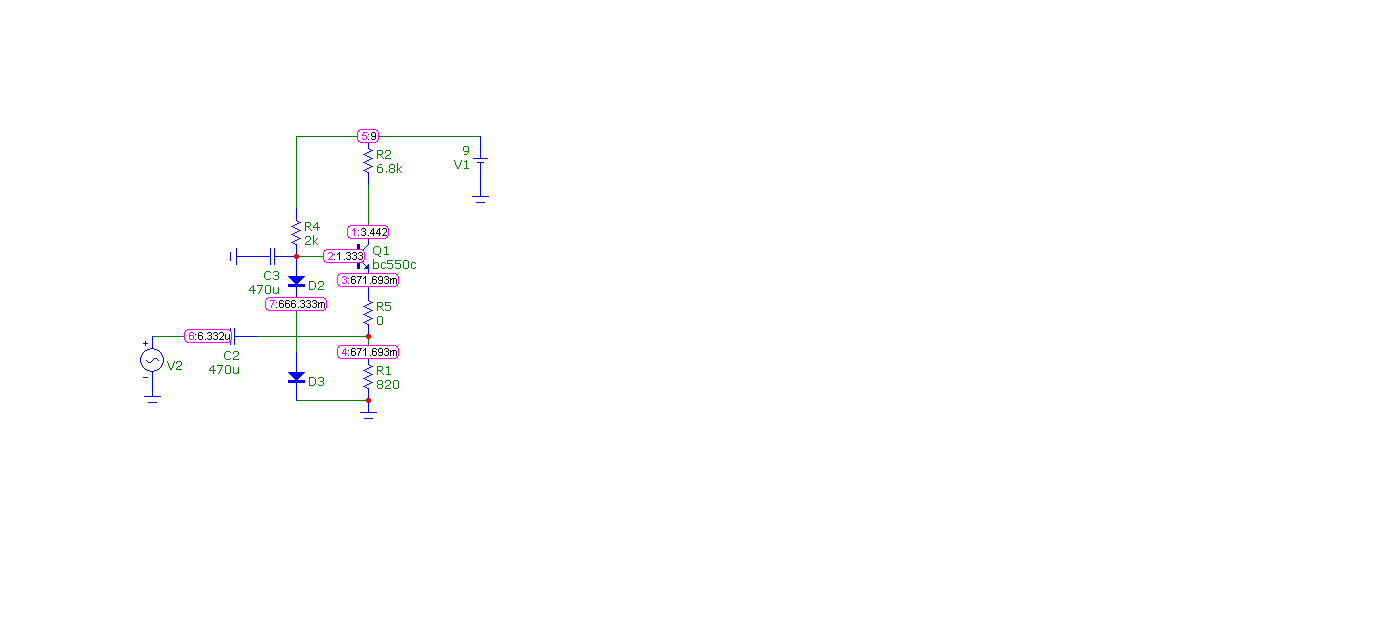 Транзисторы включены с общей базой, поэтому начинающим советую не менять номиналы элементов в железе без предварительного симулирования, так как тут почти все элементы заметно на что-либо влияют