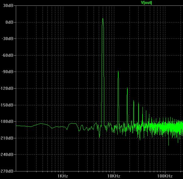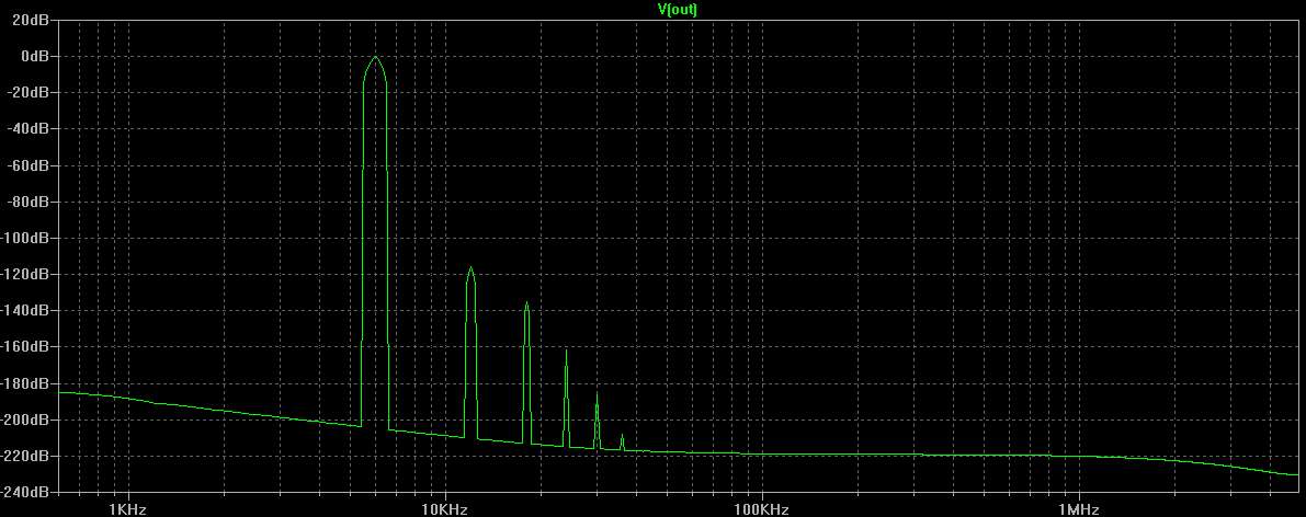 Чего тут моделировать? Эта штука ниже -70 - 75дБ (оптимист ) по гармоникам при указанных величинах нагрузки и такой амплитуде сигнала в жизни не опустится. Это просто очевидно.