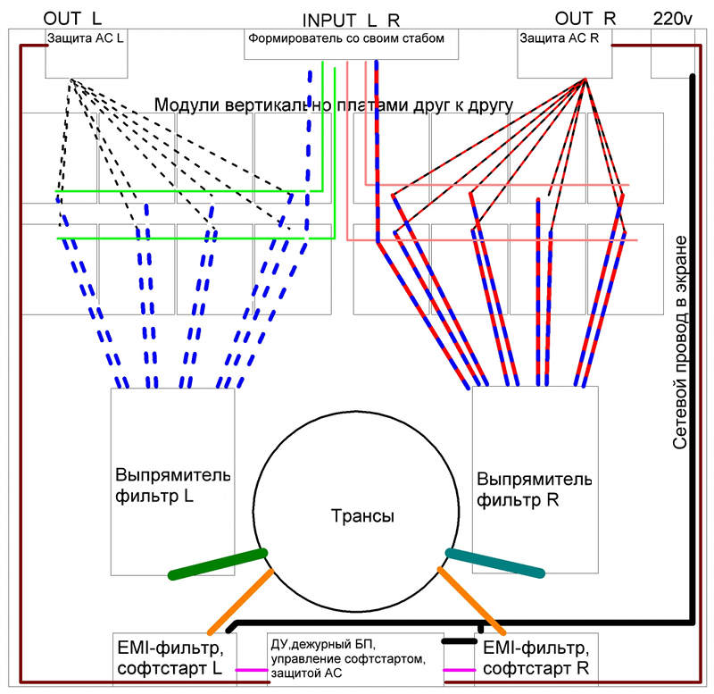 1. На макете собираю общие БП (входные фильтры, софтстарт, трансы, общие выпрямители-конденсаторы). Если ничего не взорву при запуске, в конце недели выложу фото.