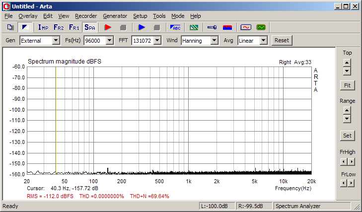 Хотя в то-же время PCM4222EVM делает сходу 155 при 16к окне... в теории при 2^20 окне даст аж 173дб Валяясь на полу, с простыми (если не хуже) трансиками, стабами, без фильтрации сети и прочего от RFI, с неподключенным входом...