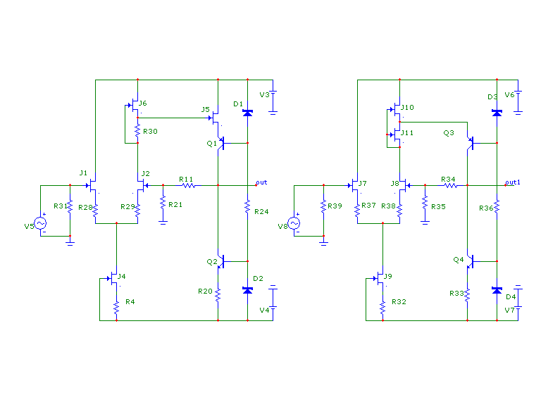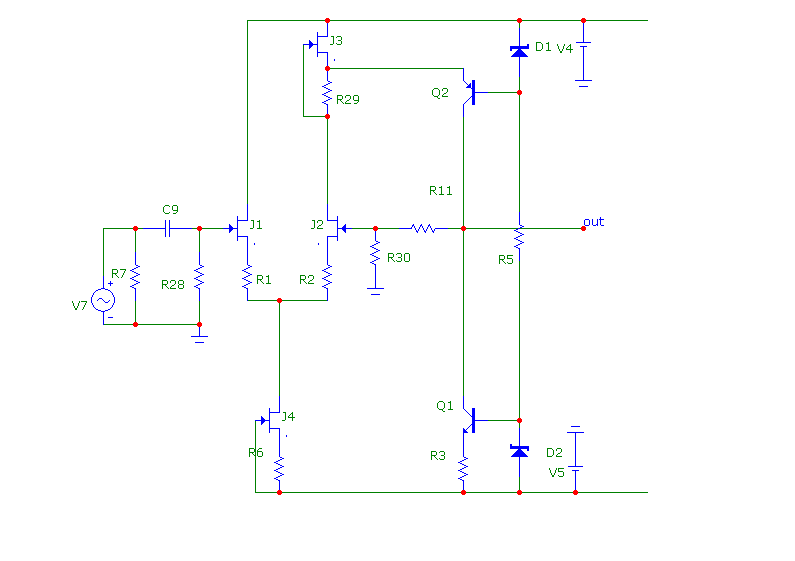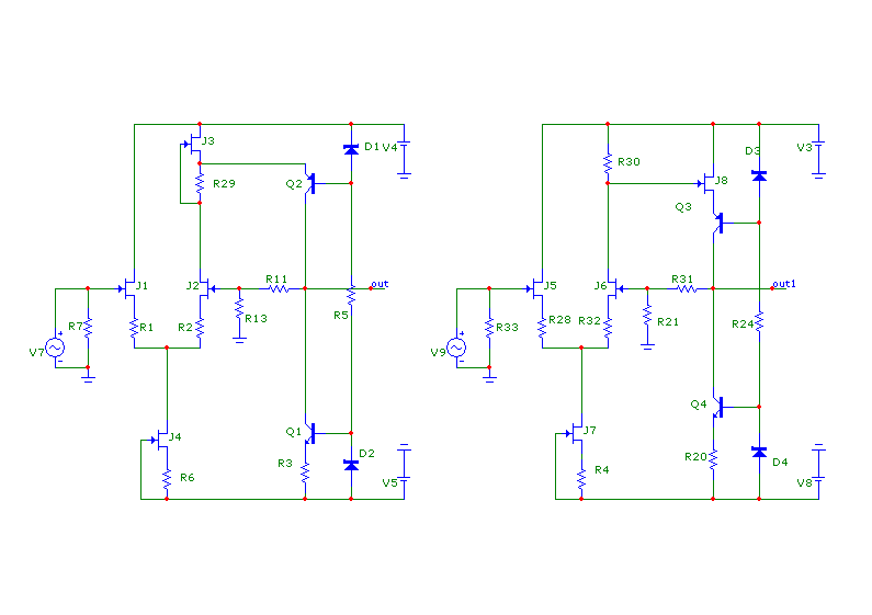 Надеюсь все поняли, что я использовал ток дифф. каскада меньше на порядок, чем ток через Q2, так что и резисторы в истоке J3 не такие и маленькие.