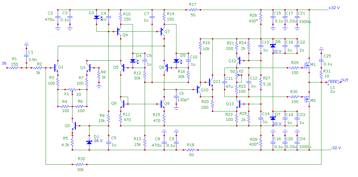 Можно и мне поучаствовать? Что скажите о таком УН? Аскетичный вариант, но на мой взгляд очень неплох. Придумал сам лет десять назад пытаясь пристроить КП303 ,КП302 и КП903 в УН, его наверно придумали до меня просто мне не попадалось. Можно поиграться транзисторами и режимами, получаются интересные варианты.