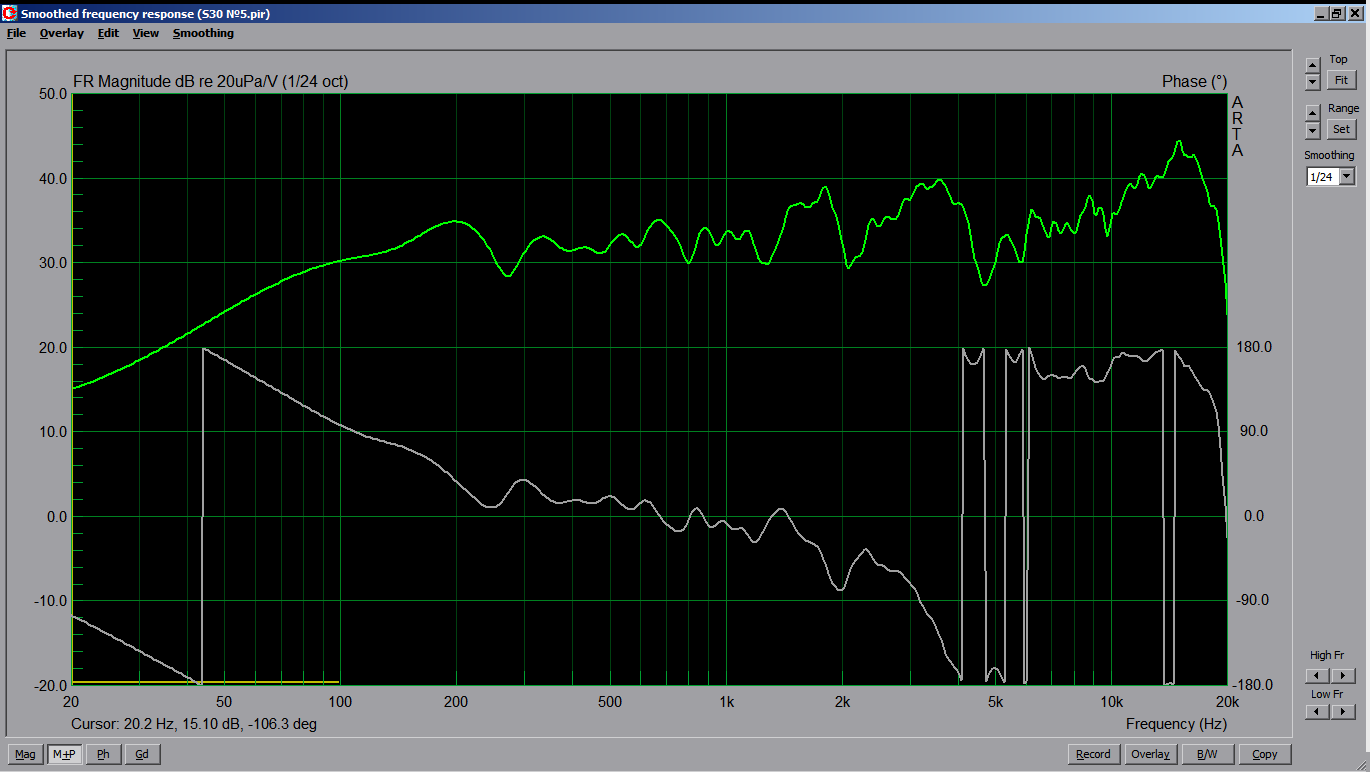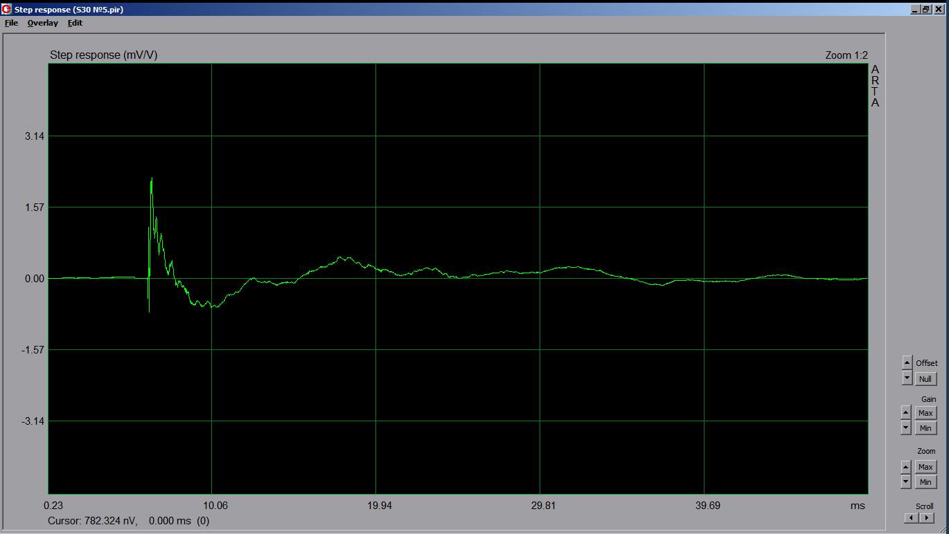 Оставшийся объём 8Л и настройка фазоинвертора оптимально подобраны для скорости переходного процесса ~25ms.
