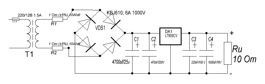 Резисторы по 1 Ому заменить на один резистор, 0,1-0,47 Ом, а то будет сильно греться и опять же, падать напряжение. Один Ом до диодного моста - это, ориентировочно, как 3-4 Ома после моста, т.е. 3-4 Вольта потерь.