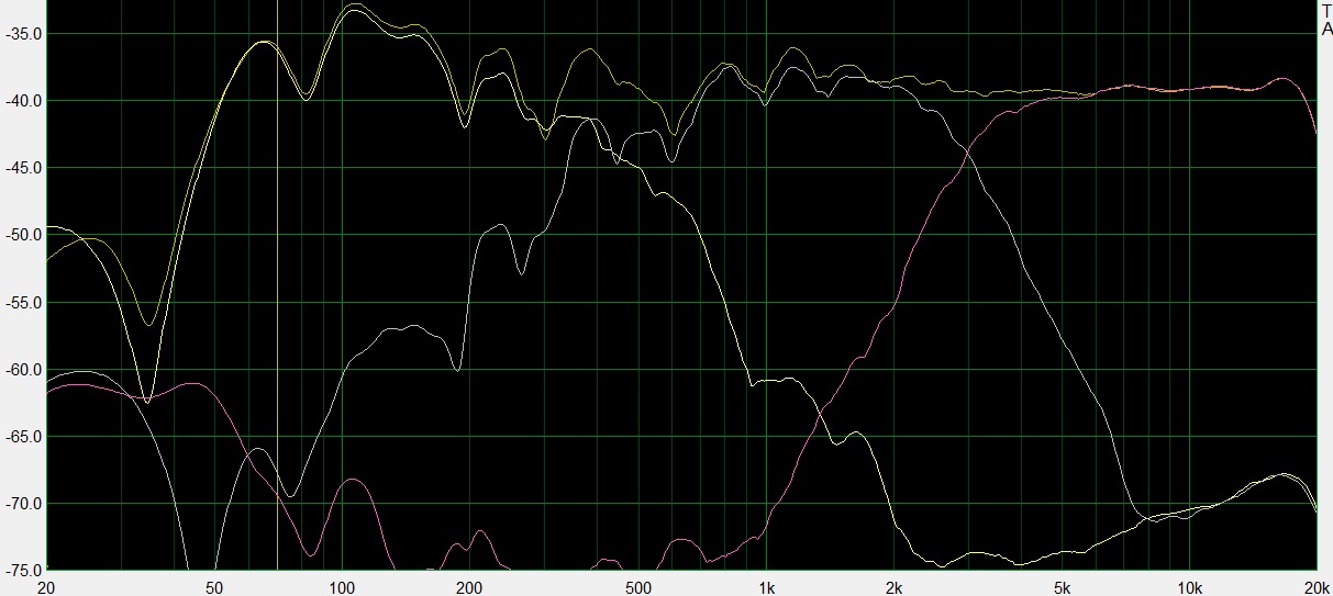 Добрый день.После достаточно длительного прослушивания провел корректировку кросса.В первоначальном варианте пики у СЧ были не достаточно подавлены,в итоге был применен третий электрический сверху + режектор.После этого,требования к точности настройки режектора несколько снизились,что позволит повторить эту АС с достаточно предсказуемым результатом.Выкладываю графики конечной настройки АС.Добавлен режектор и в НЧ полосу,т.к. на громкости выше средней ,пичек