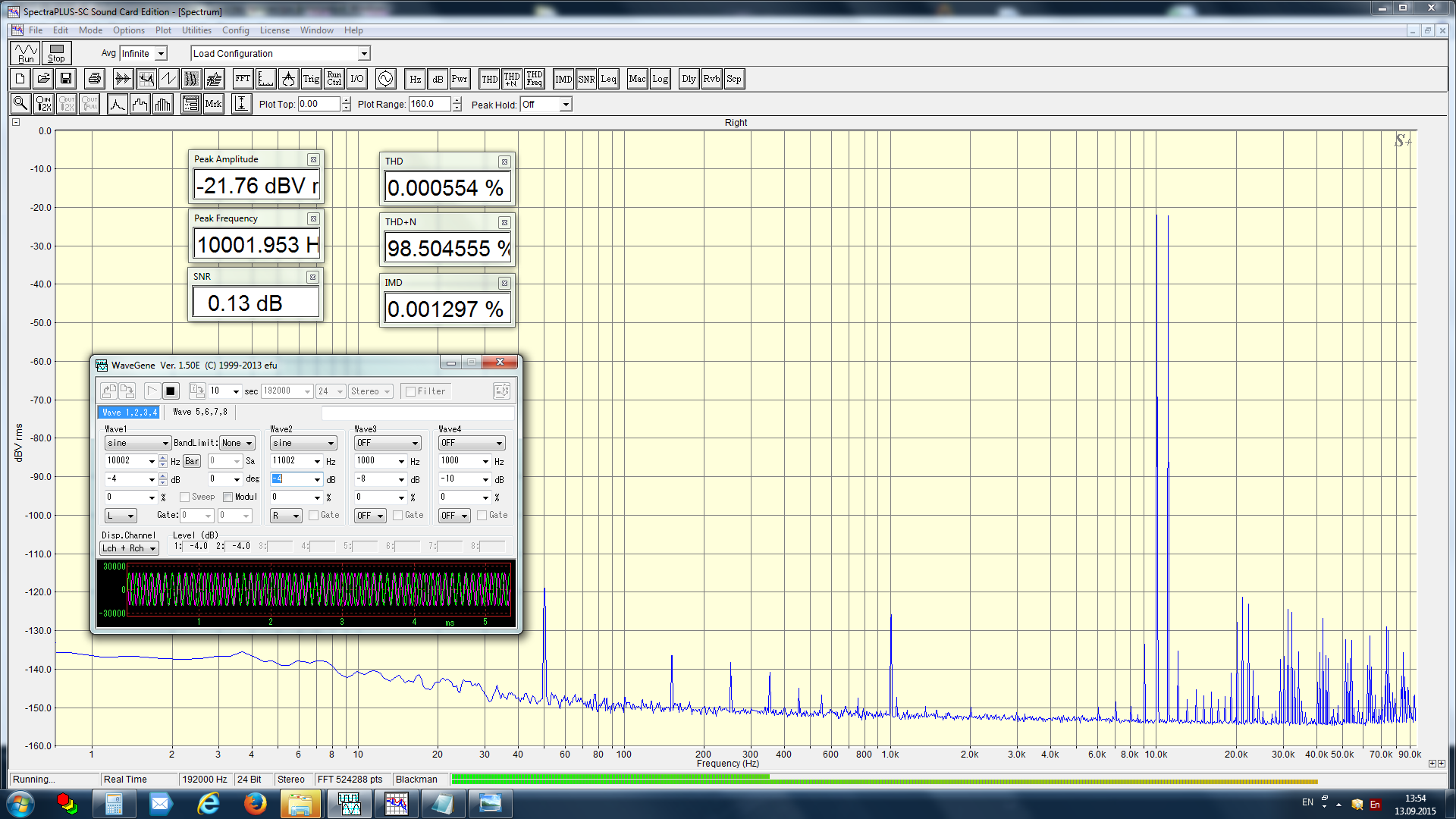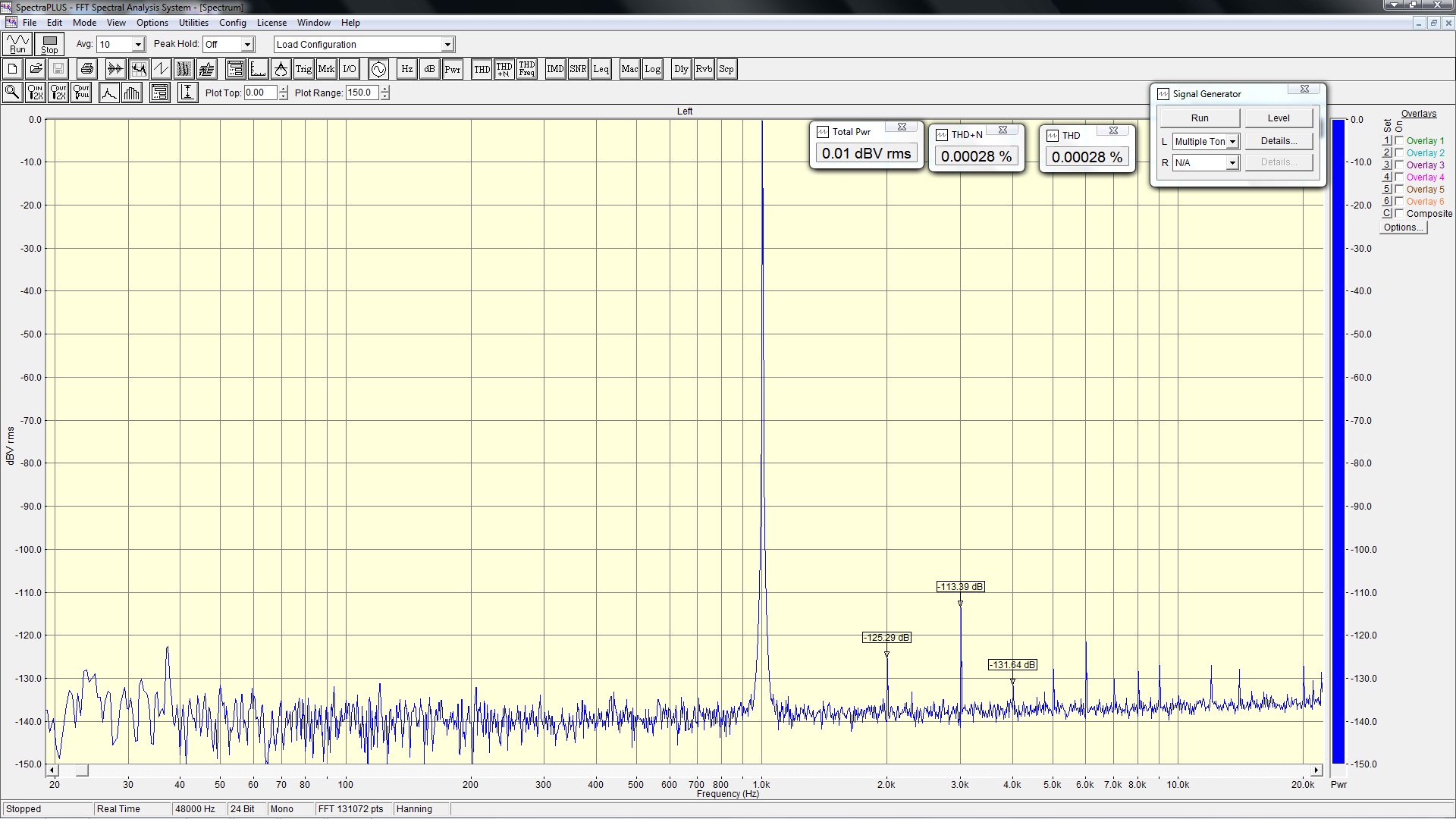 Собственные искажения измерителя составили порядка -114дБ для искажений второго порядка (компонента 1 кГц) и порядка -124дБ для третьего (компоненты 8 и 9 кГц).