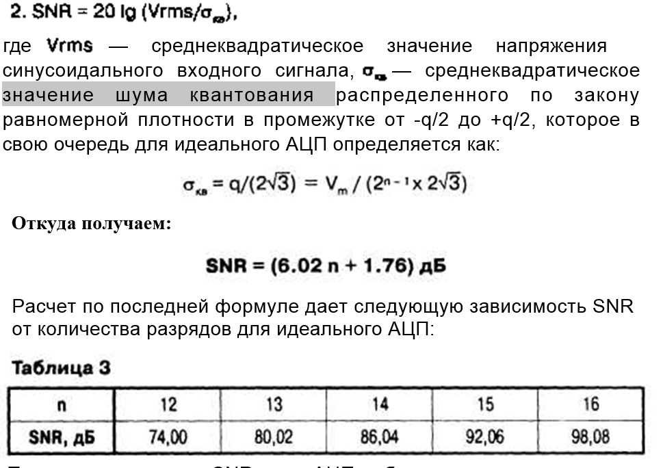 Зная теоретически (предельный) SNR для идеального N разрядного АЦП можно выразить уровень шума квантования.
