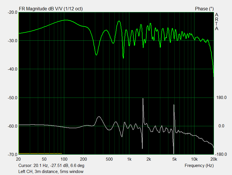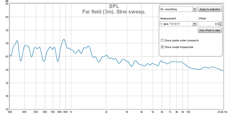 Т.е. если измерять АЧХ по импульсу с коротким окном (буквально несколько мс), то АЧХ будет более-менее совпадать с полученной в ближнем поле, но вот при использовании длинного окна (10мс и более) отраженные импусьсы будут давать создавать подъем в измеряемой АЧХ. Поскольку амплитуда отражений от стен меняется падает с частотой, то на ВЧ в дальнем поле всё так же наблюдается лишь прямой сигнал, в то время как на СЧ наблюдается подъем вплоть до 10дБ. У меня, например, получилось вот так: