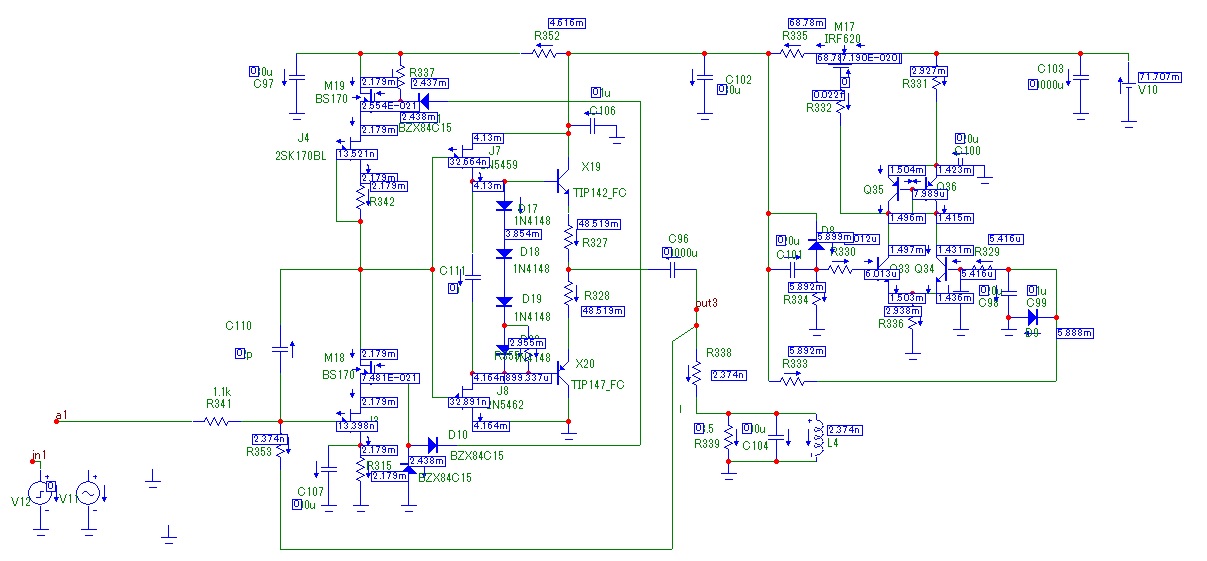 Выход нашел из прошлогоднего варианта Фуриоус, а именно в смещение на затворы Мосфетов добавить источники тока, а стабилитрон верхней половины "приземлить" на выход УН - результате половина стала как вкопанная, да и звучание мне показалось еще более "сочным", посмотрел петлевое таки увеличилось на 6Дб...