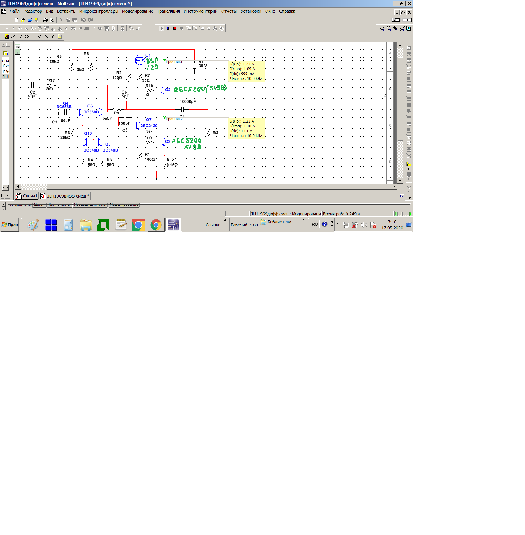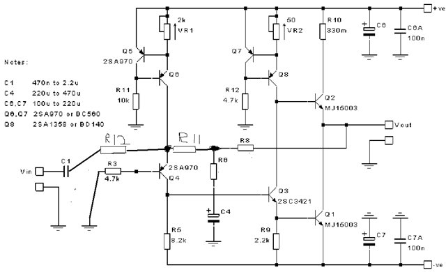термостабильность выше тк в эмиттере выходника 0.15ом дополнительную модуляцию нижнего плеча дает подключение нагрузки как на схеме повторитель перед драйвером уменьшает искажения на порядок входной каскад намного линейнее- дифф каскад с токовым зеркалом в инверт вкл