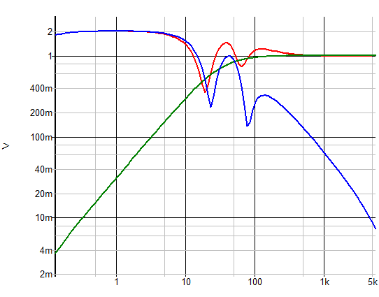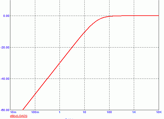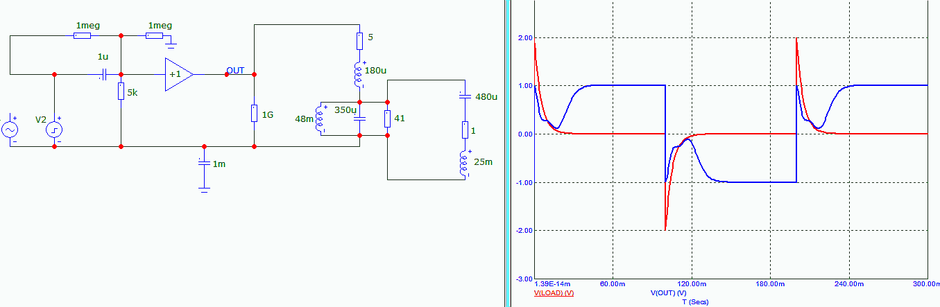 Нагрузка (красная кривая) по прежнему получает свои импульсы +/- 4 В, но выход OUT (синяя) не вылетает за +/- 2 В. По сути повторитель работает как УПТ словно входной конденсатор отсутствует