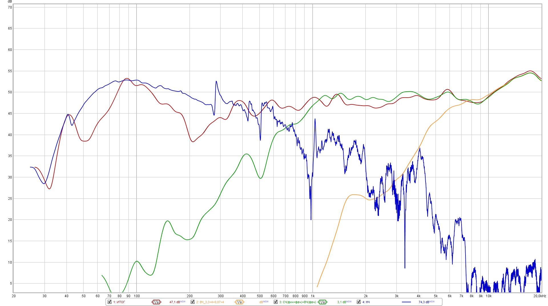 но я потом начал душить все эти горбики до уровня провала на 3...4 кГц и всё стало ещё печальнее. Сначала думал, что это влияние комнаты, т.к. в ближнем поле (5 мм от диффузора) расфильтрованные они на одном уровне. А ещё забавно то, что один СЧ динамик чуточку тише второго, пришлось 1.2 Ом ставить перед СЧ фильтром, чтобы уровнять их.