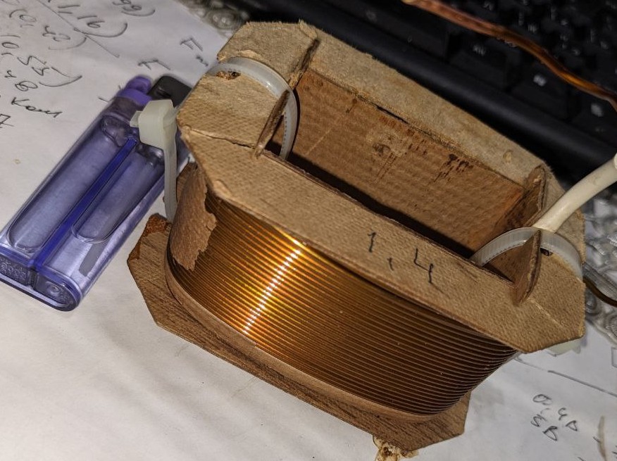 Катушка (вторичка от транса, взята для эксперимента), можно сказать, обычная для обычного кроссовера, предположим, не сильно мощной двухполоски . 1.4 мГн, 0.4 ома, провод~ 1.4, вес ~ 300 гр. И ток 2А для неё явно должен быть не предельный. Повторюсь, проблемы начинаются с 0.1А. Есть катушки, но с гораздо меньшей с меньшей индуктивностью... суть не меняется.