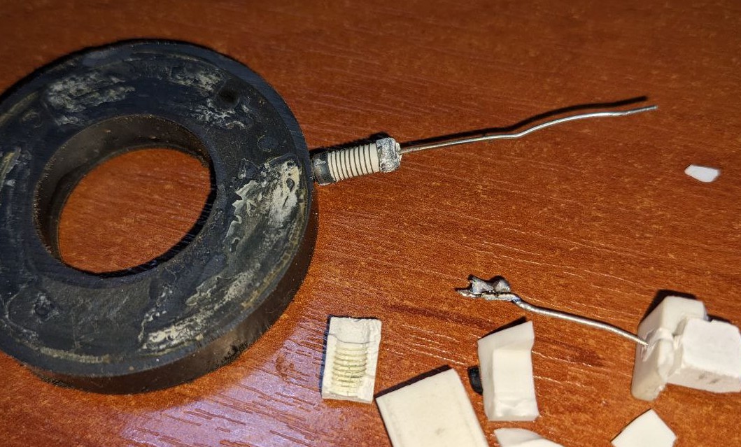 Разломал виновника появления гармоник (обычный цементный SQP, номинал 0.33). Индуктивность микрогенри, емкость пики, сопротивление тьфу... да, магнитится и что? Непонятно. Может, наводка с катухи... надо проверить.