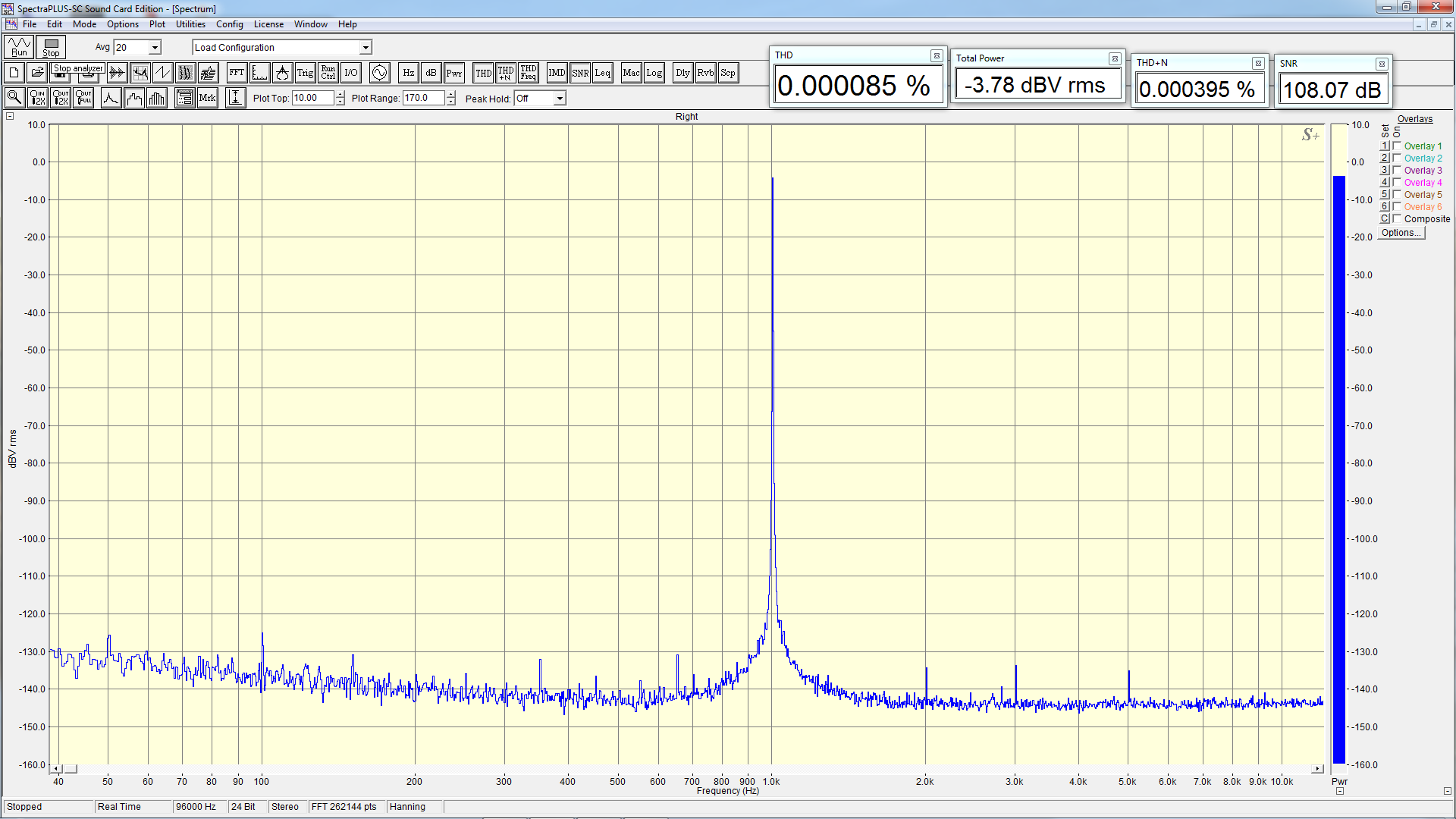 Оценка искажений IMD19+20 без нагрузки и при выходной мощности 5,6 Вт на нагрузке 4 Ом (амплитуда выходного напряжения 10 В, -10 дБ от максимального выходного напряжения):