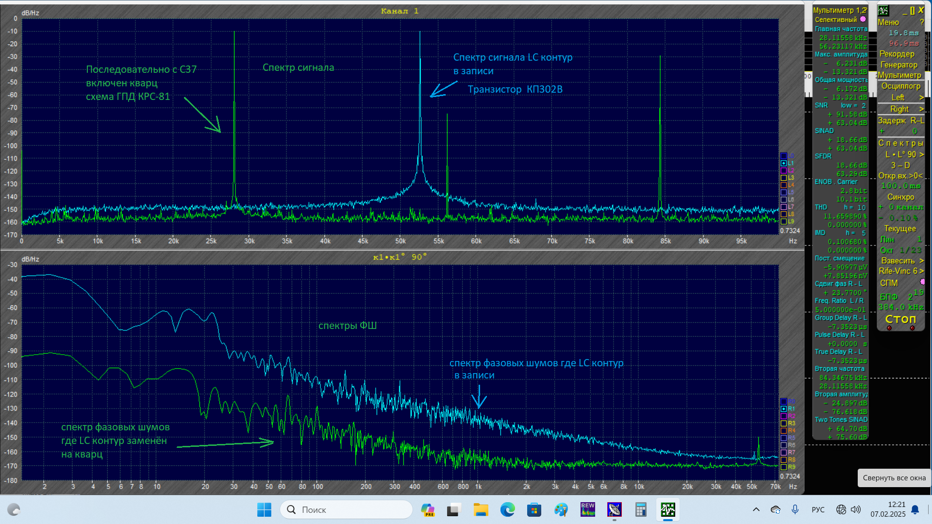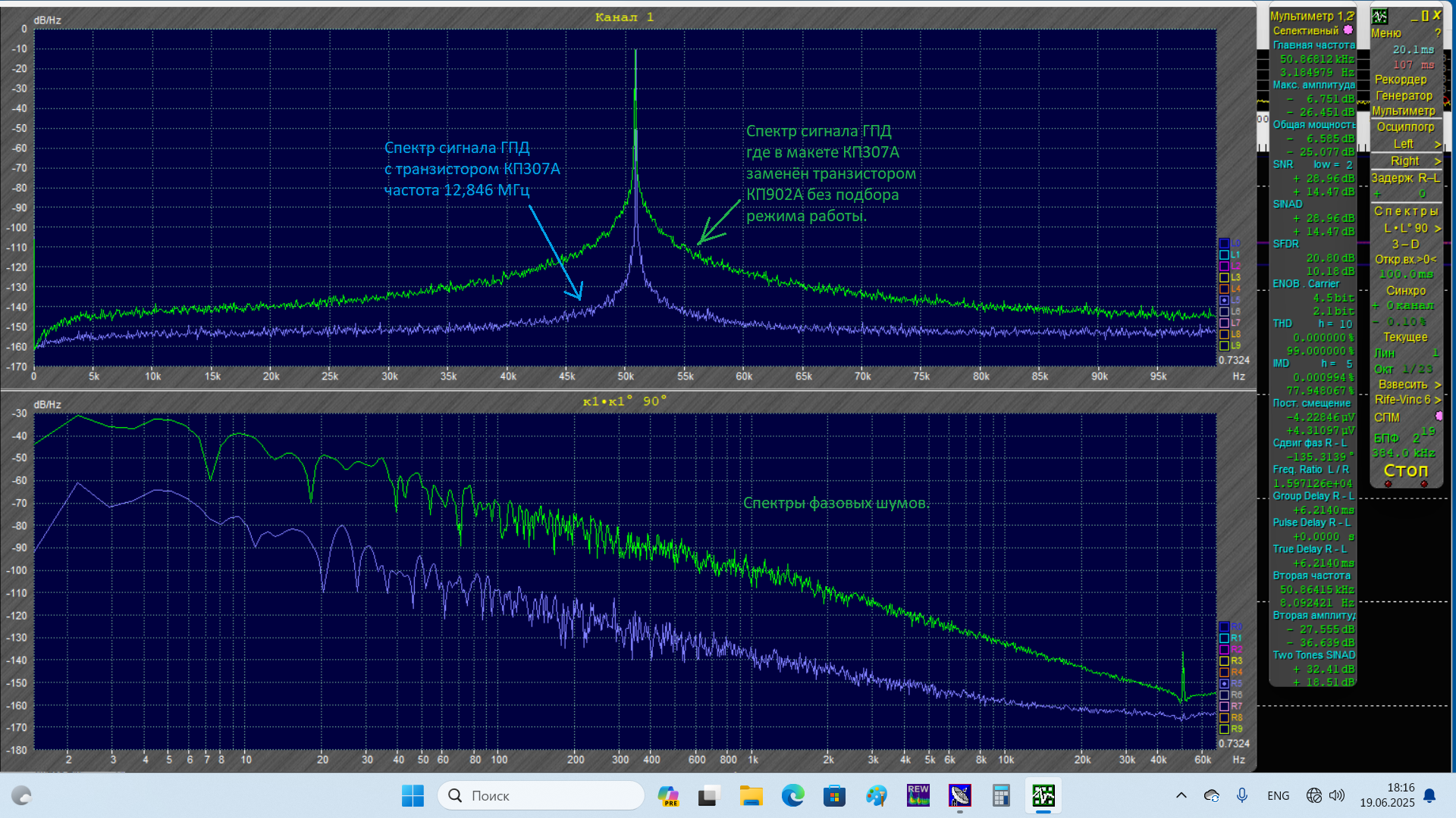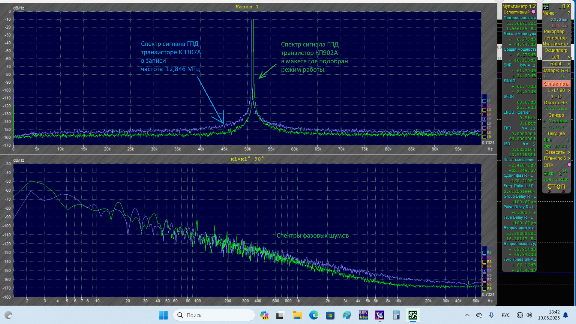 Для тех кто хочет разобраться. На рисунке спектры и фото макета ГПД, генератор по схеме "индуктивная трёхточка" с транзистором КП307А где записан спектр сигнала и спектр фазовых шумов синим цветом, далее транзистор КП307А вынут из панельки и подпаян КП902А. Режим работы не менялся. Смотрим ФШ.