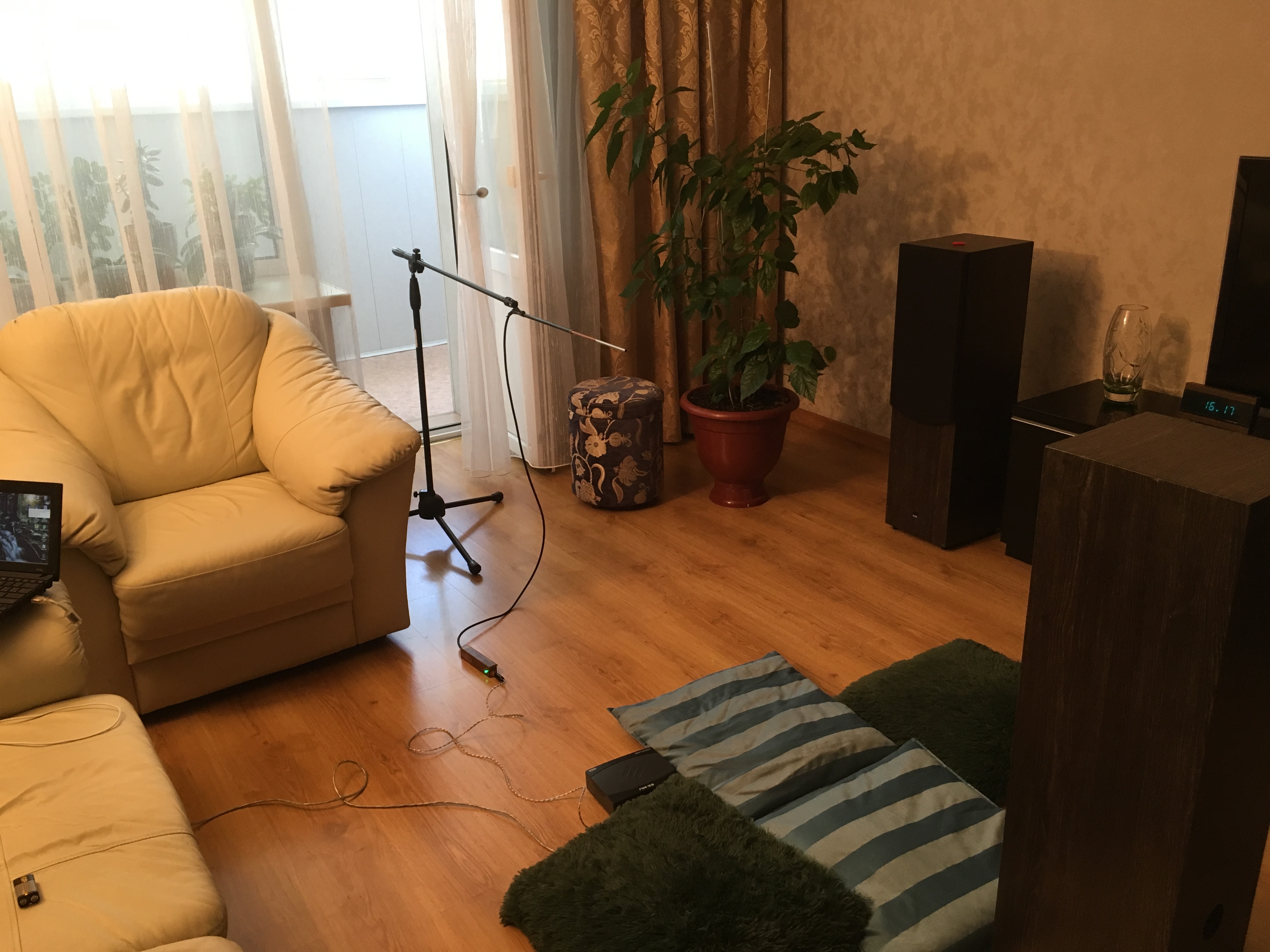 3) Контрольный из точки прослушивания, микрофон в потолок и обе колонки все динамики вместе.
