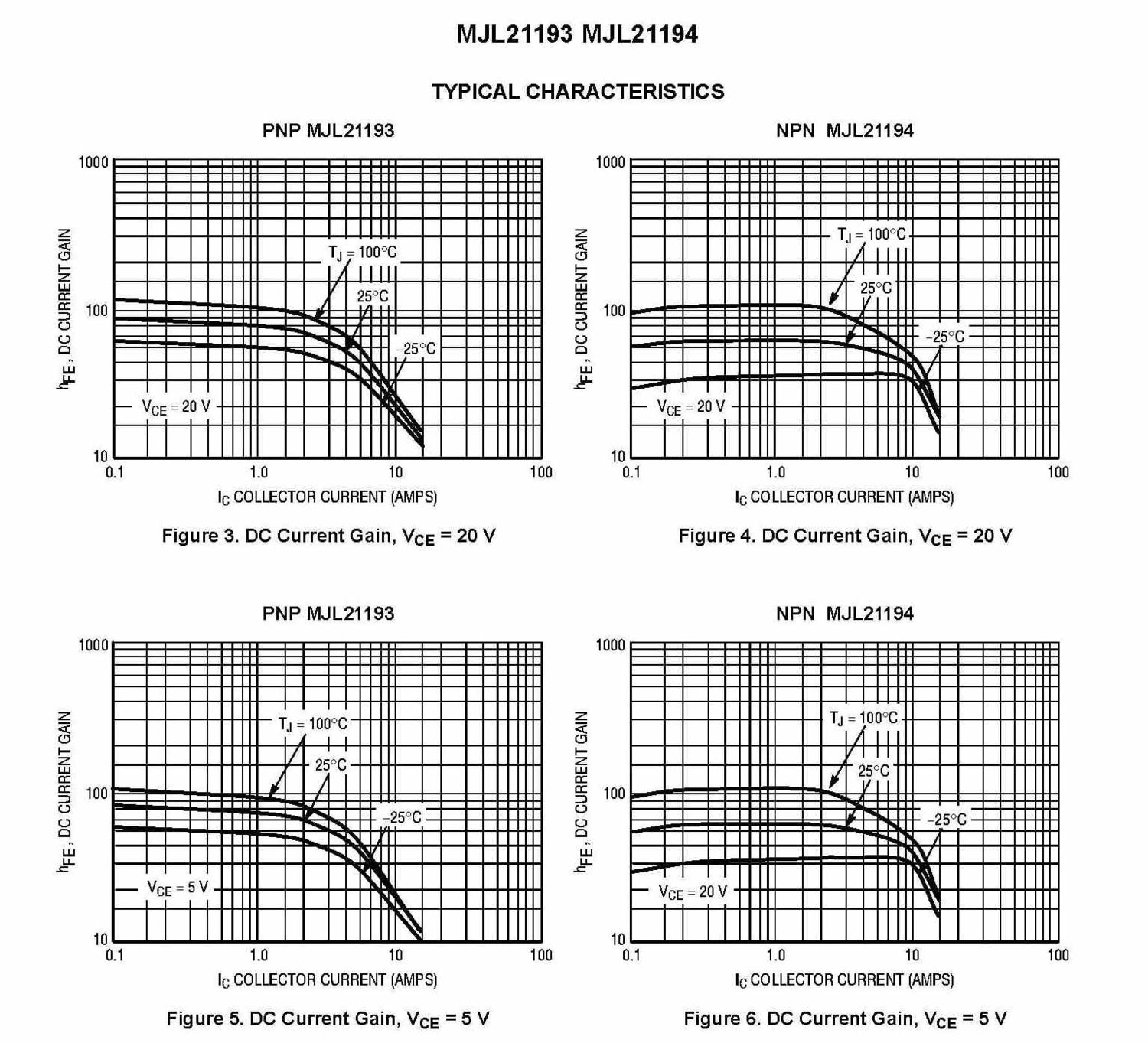 А вот для MJL4281/4302, упоминаемых выше, hFE указан от 0,01А И хотя "характер поведения" похож, но в численном исчислении разница просто мизерна, тепловые колебания при обычных кустарных измерениях на рабочих токах окажут гораздо большее влияние на значение hFE.