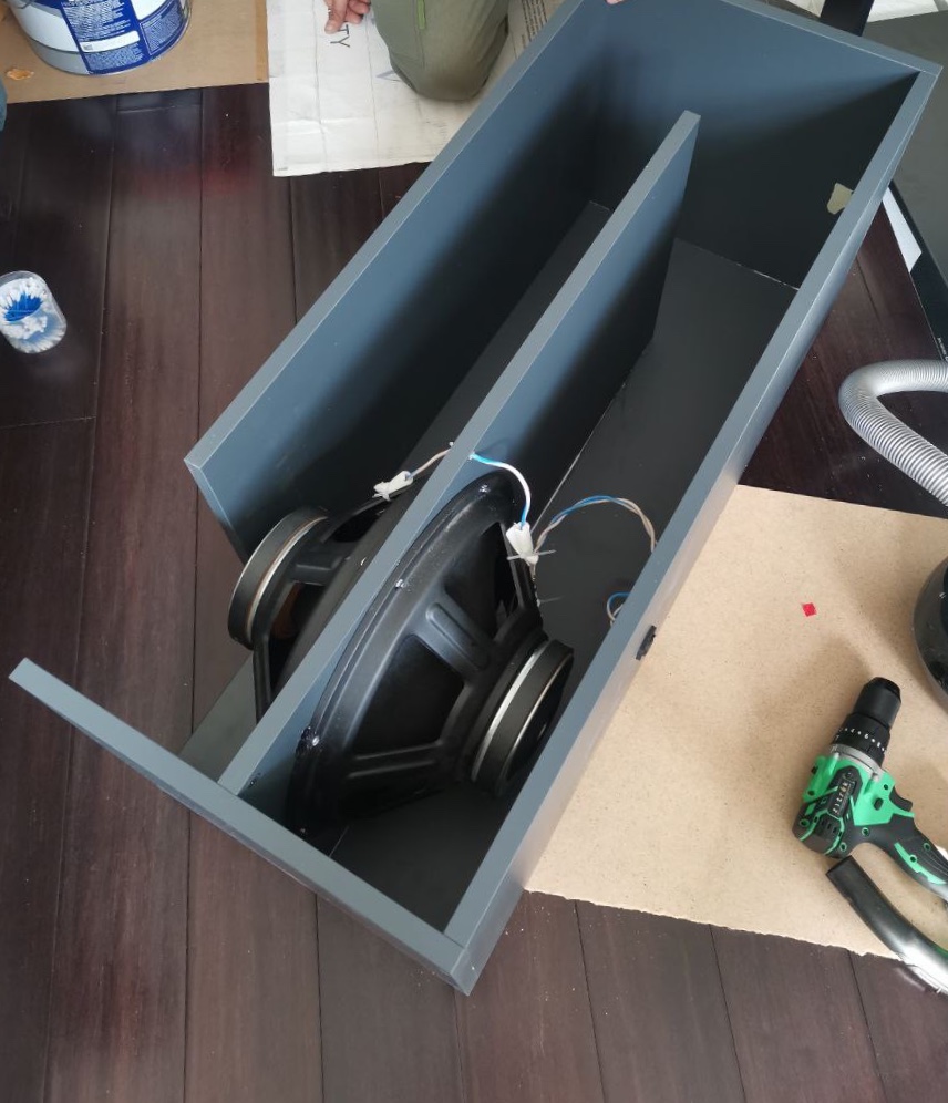 Наверно нечто похожее у меня сейчас. Две 15" в пушпул. Литров 150 наверно. Это не моё творчество, но подключил. Эффективность не высока 91-92 при чуйке каждой пятнашки 97. Нерационально, но работает неплохо, вниз особо не лезет (спад чуть выше Fs). Баса для нормальных ушей и головы более чем (а больной всегда мало). Срастается с шириками просто. На интерьер не обращаейте внимания, вокруг ремонт и бардак...Щас, фото приклею, оно в другом месте...