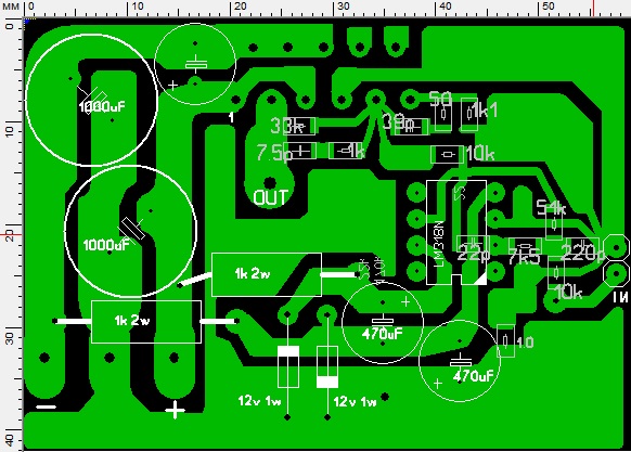 В недалеком будущем планирую попробовать включение LM3886 по предложенной схеме. За основу взял чью-то печатку и переделал под данный вариант схемы. Я не специалист в трассировке печатных плат и очень буду рад, если кто-нибудь проверит и поделится каким-либо советом.