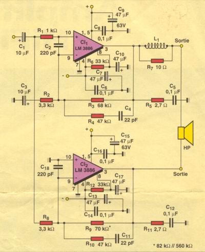 Нашел вот схемку у одного француза, не могу понять чего он там про R9 пишет: на схеме 70кОм, под схемой написано 82кОм//560кОм. В тексте что-то про это написано, но так как я по французки ни фига не понимаю, сижу вот теперь и думаю чего ставить 70 или 82 или 560. Подскажите плз. Заодно и схемку оцените (подойдет ли для саба на 100ГДН-3).