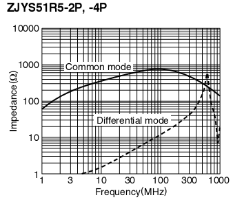 Поискал среди доступных мне сигнальных синфазников, вроде бы ZJYS51R5-2P от TDK пригоден для USB1.1, но прямо в даташите это не указано, поэтому может кто знает это точно или даже применял? Рисунок импеданса привожу (как я понимаю, важен диф. импеданс до 12 МГц, у ZJYS51R5-2P получается менее 2 Ом, надеюсь это достаточно мало для надёжной работы USB).