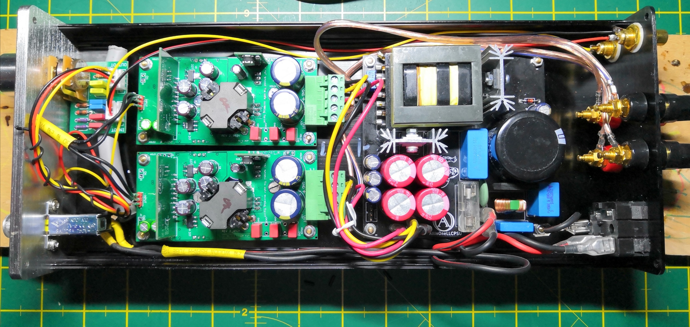 Это нереализуемо в данном корпусе (мешают платы), поэтому этот совет (как и РГ Никитина и прочее) для меня бесполезный, извините. Следующий совет - взять другой корпус - тоже, пожалуйста, не предлагайте. Он у меня намеренно такой, поскольку я хочу сделать усилитель компактным.