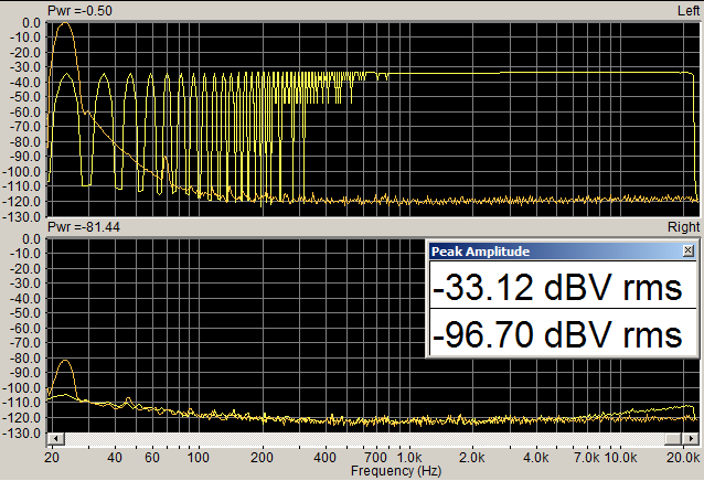 Это не прямое проникание на вход, т.к. оно почти противофазно, а имхо через опорное напряжение АЦП (оно общее для обоих каналов, зашунтировано электролитом - потому все и ухудшается на нч) т.е. на нем появляется синфазное с входным, которое попав во второй канал даст противофазный сигнал (при полном нуле на входе)