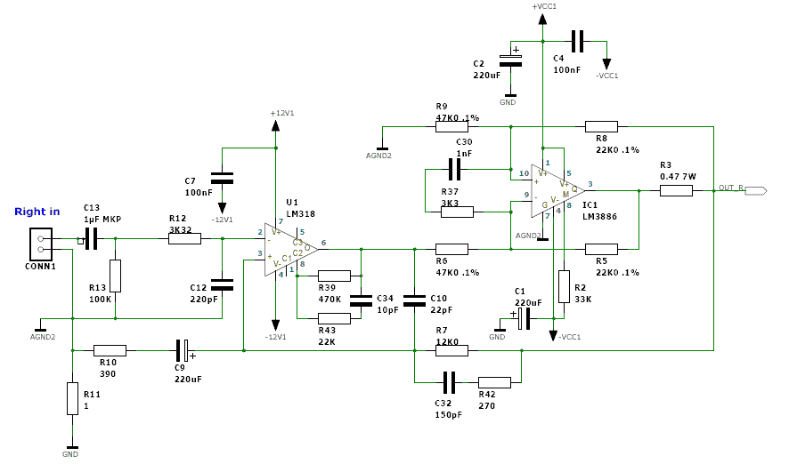 LM3886 охвачена ООС и ПОС, там нет ошибок с номиналами резисторов?