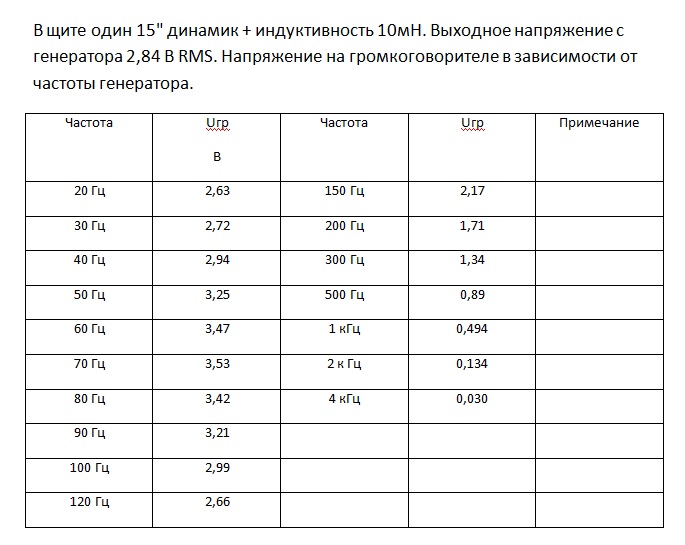 Всем добрый вечер. Сегодня к 15" динамику установленному в щит, присоединил последовательно дроссель в 10 мН. Подавал на эту связку синусоидальное напряжение RMS 2,84 В с различной частотой, а на громкоговорителе измерял напряжение. Вот что получилось. Нажмите на изображение для увеличения.