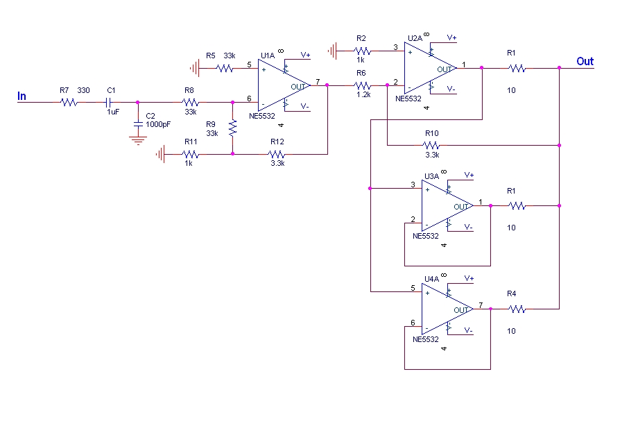 Я тут на досуге, несмотря на предостережения, собрал усилитель на 4-х NE5532 (были под рукой, да и паять в 2 раза меньше). Хотелось быстро и просто, какое-то время изучал даташиты на 5532 и 5534 и не нашел разницы, кроме того, что 5532 скорректирован для работы повторителем. Если sia_2 еще сюда заглядывает, возможно пояснит, что он имел в виду, когда говорил о низкой нагрузочной способности 5532. Мощности выходной хватает с огромным запасом, при питании +/-12V на максимальной громкости наушники буквально прыгают на голове, слушать просто больно. Играет вполне достойно, искажения намерил на скорую руку порядка 0.01-0.013%, учитывая, что звуковая карта со входа на выход дает 0.007%-0,009% - очень неплохо, как мне кажется. Шум не слышен.