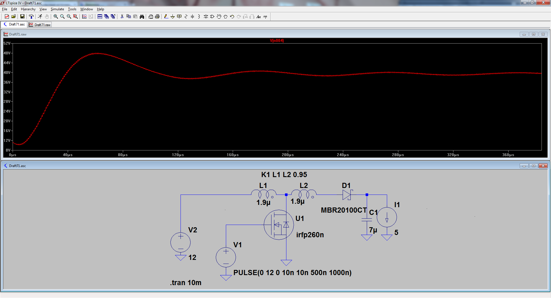 Можно ведь и в step-up приделать что-то вроде автотранса? Я тут немного посимулировал.. При добавлении второй, связанной с первой, индуктивности выходное напряжение поднимается хоть и не намного. Без 2-ой индуктивности было в среднем 30в, при добавлении получилось почти 40В при условии постоянного Кзаполнения и неизменном токе потребителя..