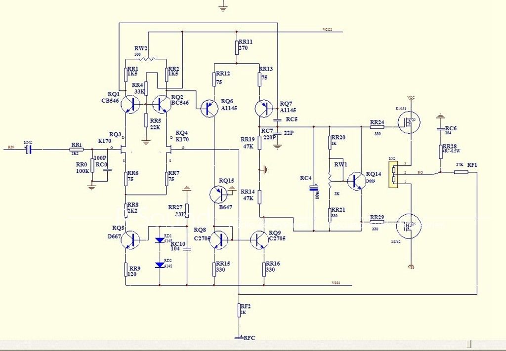 Данный девайс может собрать даже пьяная макака.Вся настройка сводится к установке тока покоя.Требования: схема критична к разводке платы.Чем меньше плата, тем лучше, очень хороший результат получился с запитыванием выходных трнзисторов от мощного источника питания а УН с запиткой от стабилизированного источника питания со своим отдельным трансом.Выходники лучше всего утопить до корпуса в плату, откусив остатки ног снизу платы.Угу, чтобы ферритовые бусины не одевать.Транзисторы дифкаскада лучше все-таки подобрать по h21э и они должны стоять близко друг к другу, через термопасту прижаты один к другому. Ну и чтобы они никуда не делись, я обычно одеваю сверху термоусадку и усаживаю ее обычной зажигалкой.Надеюсь, объяснять, для чего это делается с дифкаскадом никому не надо.Теперь про диод в схеме. Можно и транзистор включить вместо него ( в диодном включении). А зачем? Лично у меня лежат два пакета - в одном тыща штук 1N4001, в другом столько же 1N4148.Хватит до пенсии.
