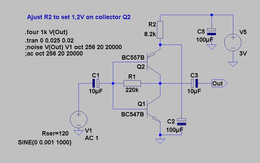 Просматривал странички про микрофоны и заметил "красивую" конструкцию схемы преда с малым количеством деталей, попробовал в симуляторе и ....... дикие параметры: Потребление тока 0.2 мА, питание 3В, Ку=500, искажения 10% и т.д.......