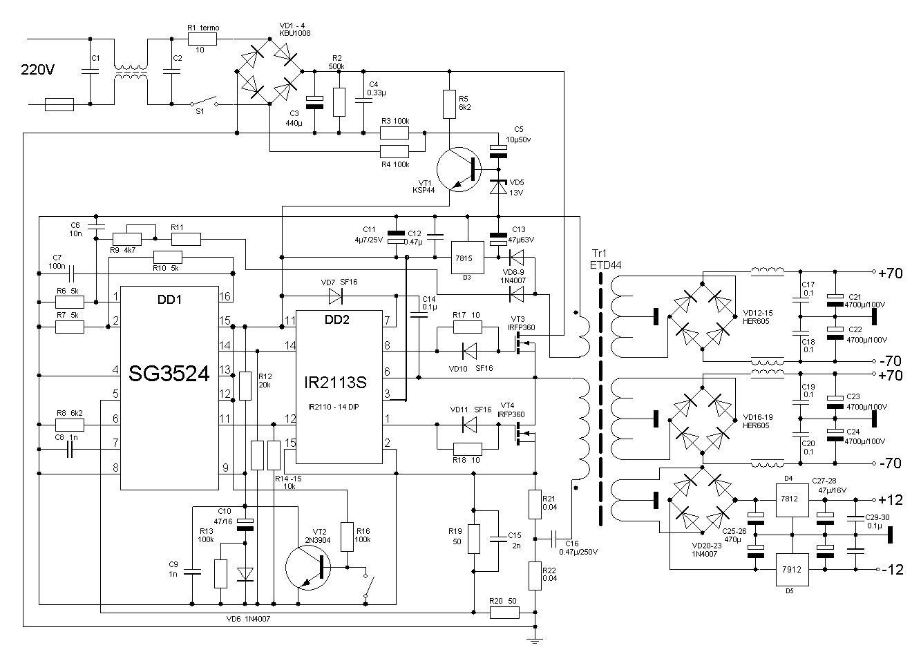 Давно почитываю сей форум, и вот надумал слепить собственный импульсник для усилов. Это полумостовая стабилизированная схема на LM5030 и IR2110, есть ограничения по току, мягкий запуск. Надо еще допроектировать обратную связь и посчитать трансформатор.