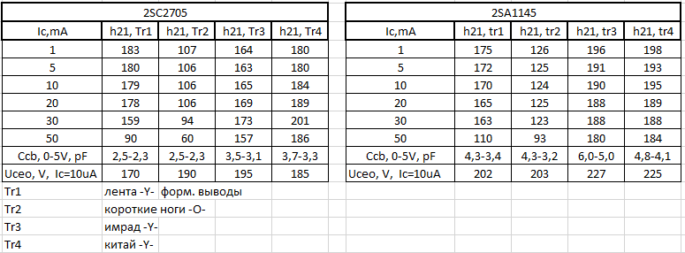 А за что мы любим пару 2705/1145? Правильно, за маленькую емкость коллектора. А как с этим обстоят дела у подделок? Не очень то хорошо. Емкость коллектора стабильно больше примерно в полтора раза, расплата за больший кристалл. Что соответственно происходит с граничной частотой усиления можно только догадываться, но думаю больше она точно не стала, а скорее упала тоже раза в полтора- два. Как это измерить на коленке пока не придумал. С напряжением пробоя проблем нет - оно и у оригиналов и у подделок выше нормируемого производителем.