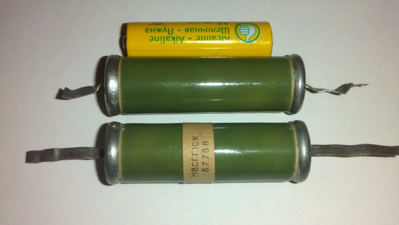 Доброго времени суток.Никто не подскажет что это? Эти штуки были извлечены из прибора с названием "Измеритель скорости коррозии".Ни ёмкость ни сопротивление измерить не удаётся.Маркировка МВСГГ10Ж Б.7.788. От руки ещё написано +52000.Рядом для сравнения пальчиковая батарейка.Просто любопытно что это такое может быть.
