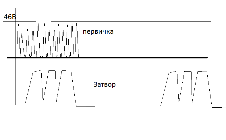 Подскажите, если на первичке такие пики, как на приложенной картинке, что происходит с преобразованием в феррите? Проблема появилась в схеме, которая дергает затвор, на первичке пики, частота этих пиков получилась 1Мгц, самые высокие пики 46В, при напряжении питания 12в. Никаких снабберов нет, изучаю пока сами проблемы преобразования.