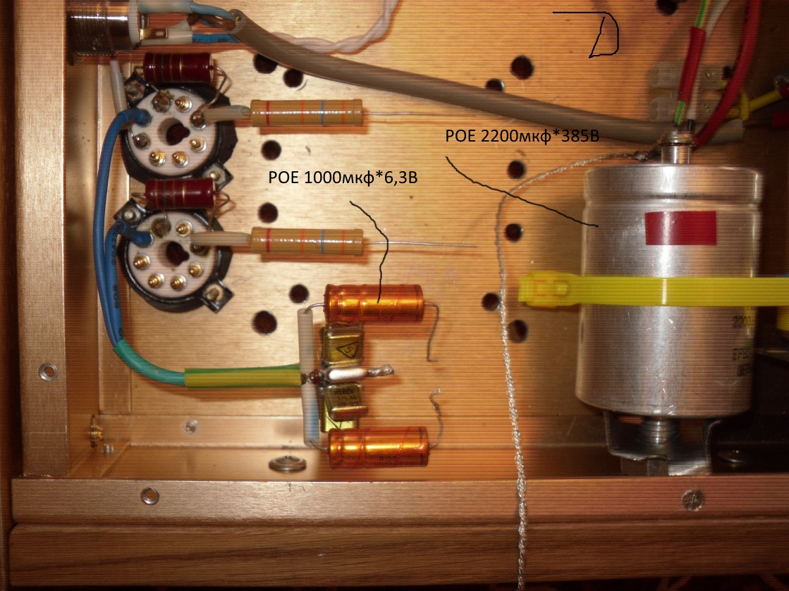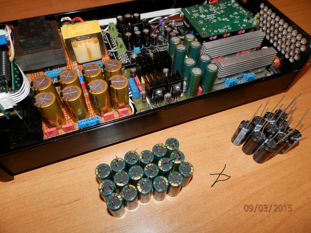 В питании после выпрямителя. 2 по 10000UF. Они большие очень 3x6 см. Мундорф с теми же параметрами 3х4. Корпус был бы поменьше. Ну это не имеет смысла, если это на звук положительно не повлияет. То есть только ради корпуса менять не буду.