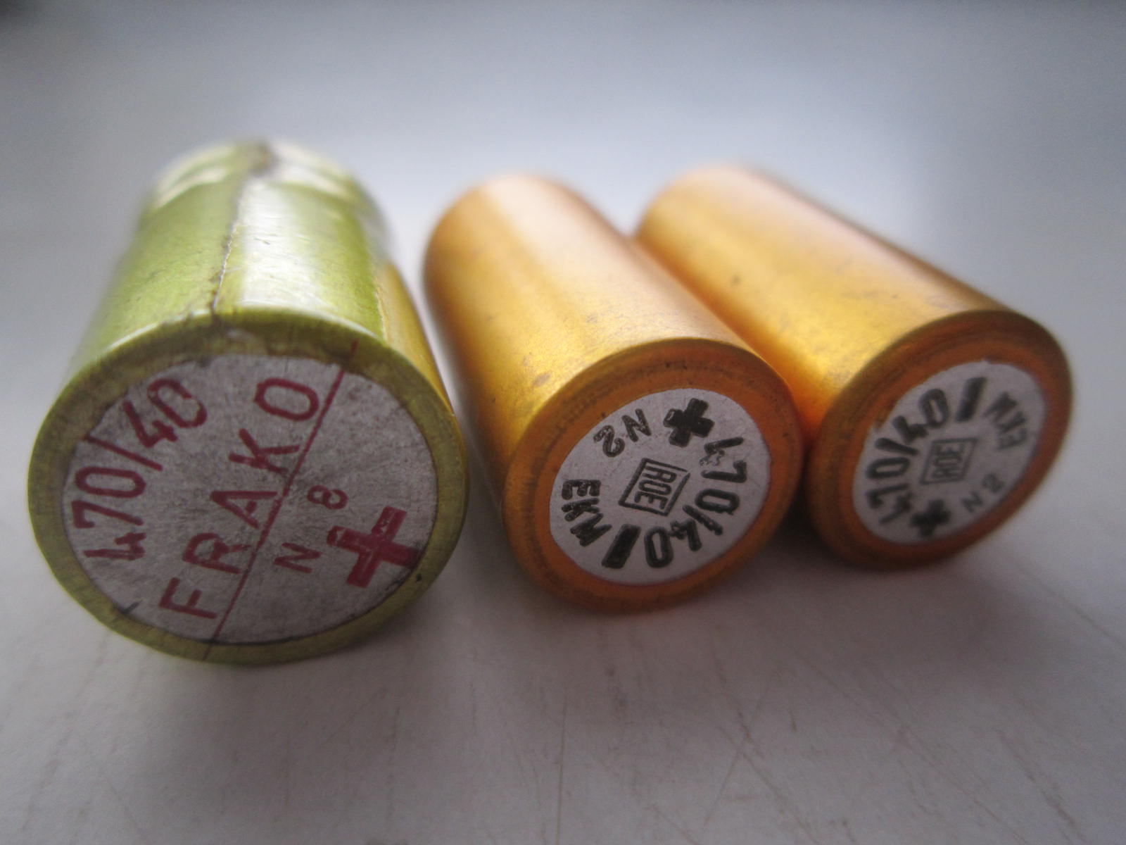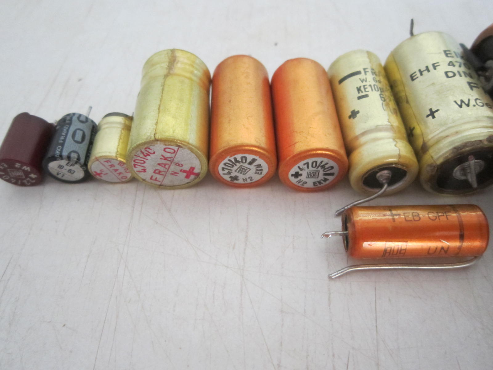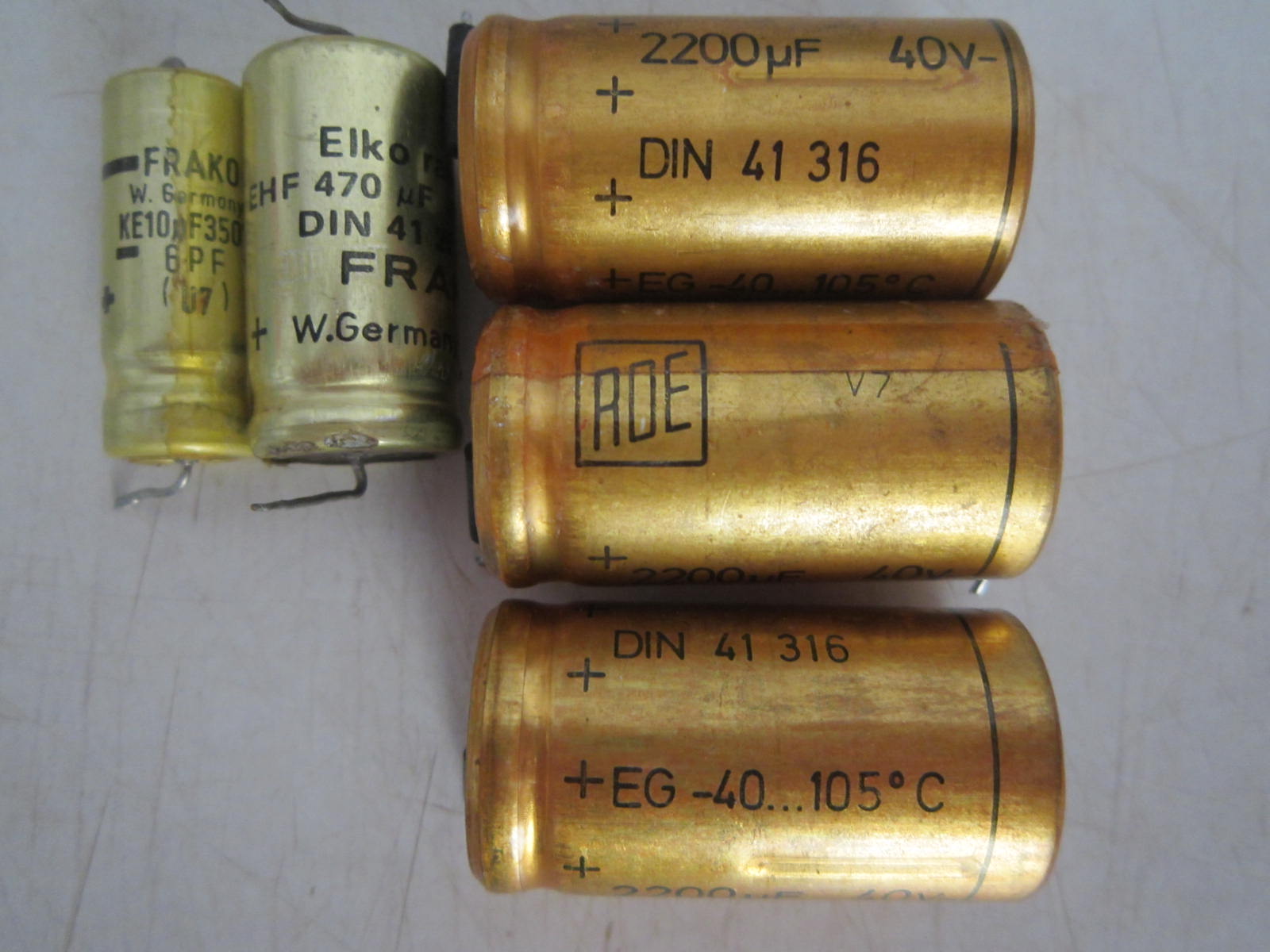 FRAKO - N3 1 мкФ.63 В - (1,271...1,365 мкФ/1,7...2 Ом). FRAKO S9 - 2,2 мкФ.63 В - (2,562...2,788 мкФ/1,6...2,2 Ом. FRAKO KE GPF (U8) - 4,7 мкФ.350 В - (5,795...5,912 мкФ/2,8...3,4 Ом). FRAKO EP 10 мкФ.63 В - (11...12 мкФ/1,2 Ом). FRAKO U2 10 мкФ.63 В - (11,6 мкФ/1,7 Ом). FRAKO KE GPF (U7) - 10 мкФ.350 В - (11,6...12,2 мкФ/1,3 Ом). FRAKО EPJ UN 22 мкФ.63 В - (28,5 мкФ/1,6 Ом). FRAKO EPZ W4 470 мкФ.16 В - (562 мкФ/1 Ом). FRAKO EHF N8 470 мкФ.40 В - (516 мкФ/0,09 Ом). FRAKO Elko rauh IA DIN41 257 GPF 470 мкФ.40 В - (516 мкФ/0,01 Ом). 116 j8 ko 47 мкФ.50 В - (51 мкф/0,37 Ом). PH 036 k2 ko 47 мкФ.63 В - (49 мкф/0,5 Ом). ROE EKU T8 2,2 мкФ.40 В - (3,267 мкФ/1,5 Ом). ROЕ TN EBC IA GPF 4,7 мкФ.63 В - (5,35 мкФ/1 Ом). ROE EKU T5 10 мкФ.40 В - (13,5...15,4 мкФ/0,85...1,7 Ом). ROE EK W2 22 мкФ.40 В - (29...31 мкФ/0,43...068 Ом). ROЕ UN EB GPF 100 мкФ.40 В - (108...115 мкФ/0,5...0,77 Ом). ROE EKM N2 470 мкФ.40 В - (501...522 мкФ/0,05...0,08 Ом). ROE DIN 41 316 EG-40...105 гр. 2200 мкФ.40 В - (2606...3220 мкФ/0,2...0,24 Ом). В скобках измеренная ёмкость и ЭПС. Нажмите на изображение для увеличения.