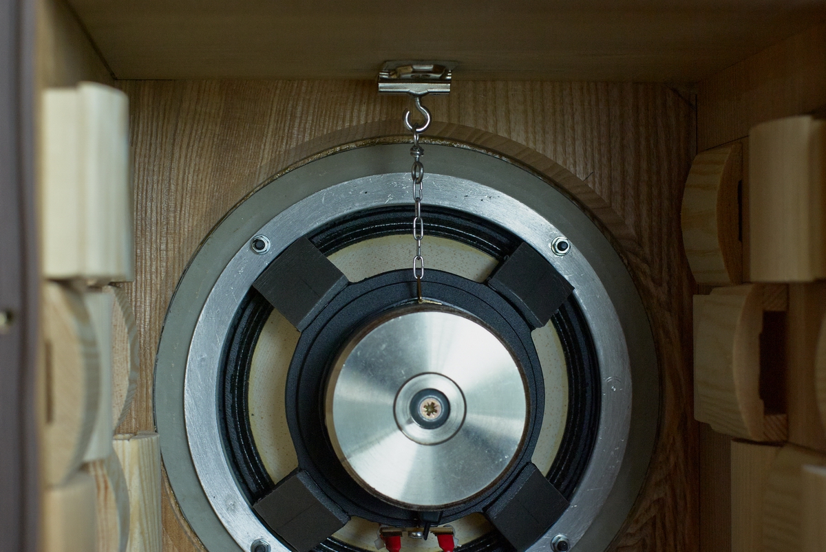 И это работает? Это не развязка, а какой то "маятник Фуко". Про "технологию" от плотницкого отвеса писал выше, продемонстрируйте реальное преимущество эдакой развязки супротив простого "крепко прикрутить динамик"?