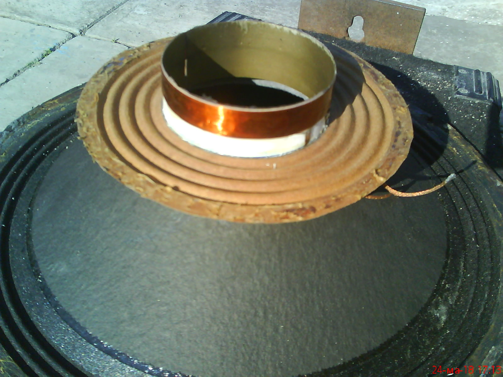 Этот динамик используется в тяжёлых условиях, катушка сильно нагревается и клей разрушается, родная была намотана на каптон, я изготовил сперва из стекловолокна, но мгновенный нагрев разрушает клей, намотал тогда на аллюминий сделав катушке дополнительный теплоотвод, стало хватать на большее время, но в итоге результат тот же клей разрушается и катушка слетает.....