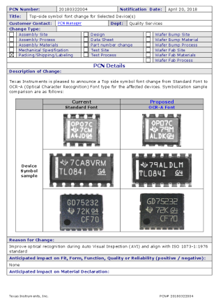 Попался файл, где TI сообщила в 2018г. об изменении шрифта (на "рожки" в 4-ке) по крайней мере для 5532 в официальном извещении (полный список затрагиваемых компонентов в файле). Но вполне возможно, что есть и другие извещения по другой номенклатуре Нажмите на изображение для увеличения.